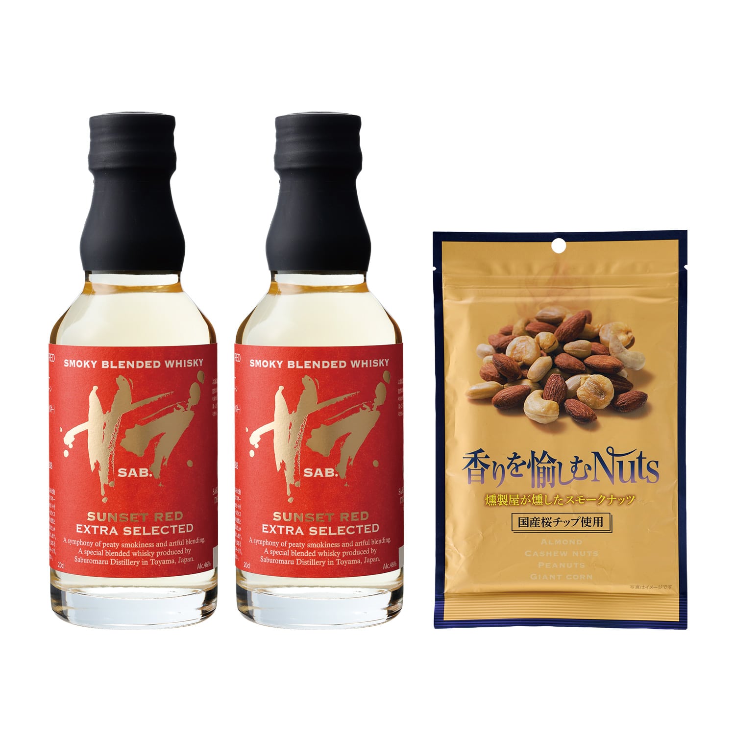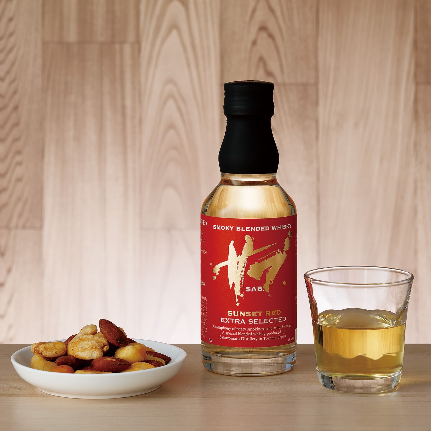 富山の壮麗な山々と、その恵みである清冽な水。雄大な自然と水の循環が、繊細な季節の変化と人の手仕事が、日本でしか、富山でしか生まれないウイスキーを育みました。〈三郎丸蒸留所〉がつくるまろやかでスモーキーなブレンデッドウイスキー、「サブ サンセットレッド」。今回はおつまみをセットでお届けします。