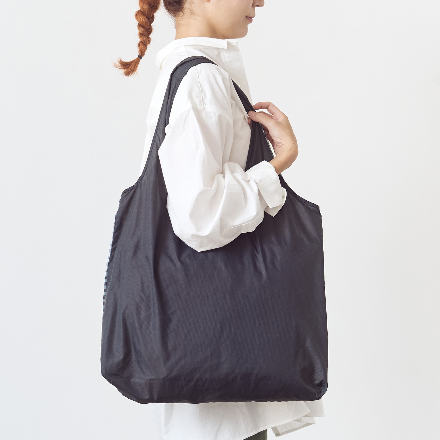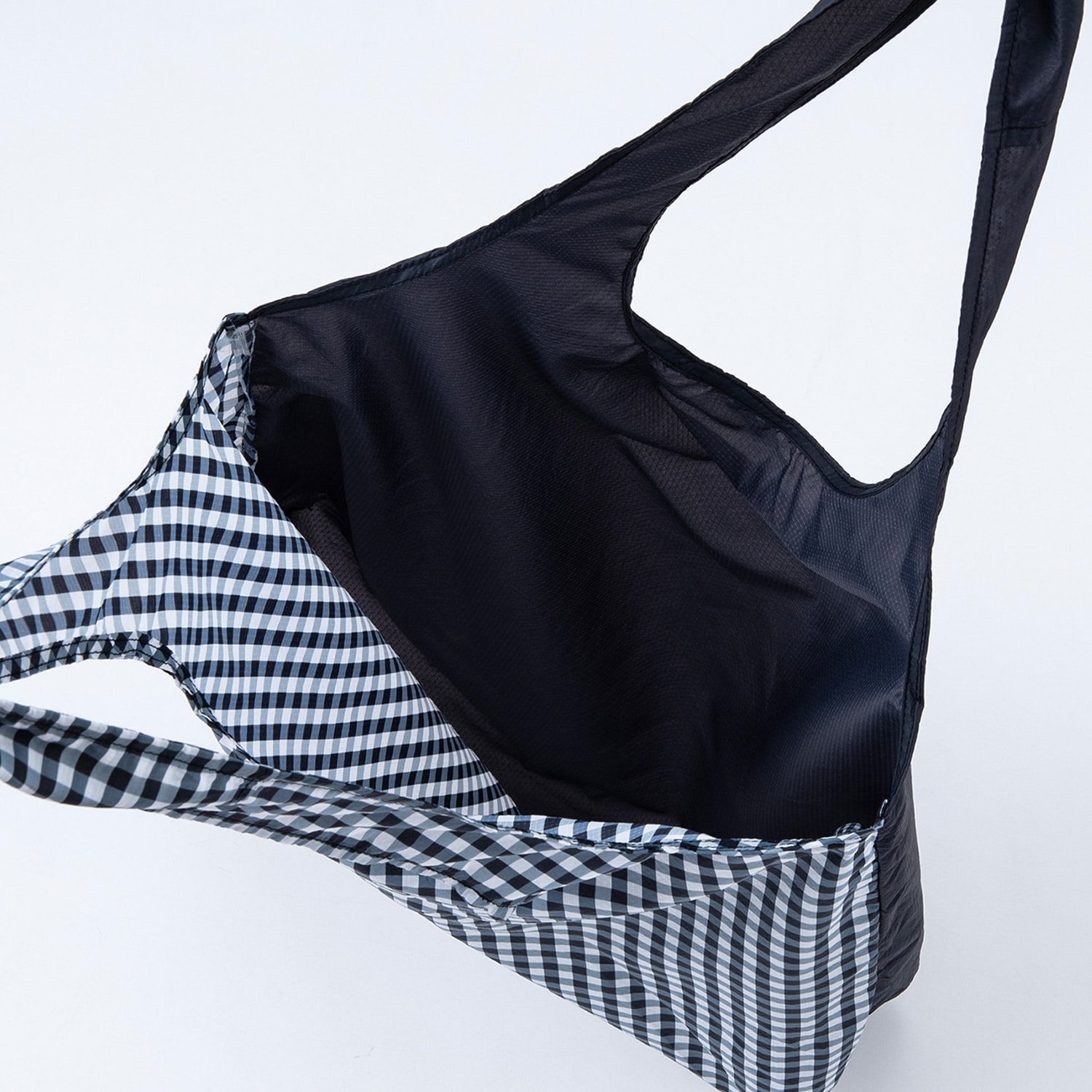 リップストップナイロンを使用したエコバッグ。重さはわずか25gで、手のひらにすっぽり収まるサイズ感ながら容量は19Lあります。収納袋は本体に縫い付けられており、たたまずにくしゃくしゃと袋に収納することもできるため、普段使いに便利なアイテムです。表側はギンガムチェック柄、裏側はブラックの2タイプでお楽しみいただけます。