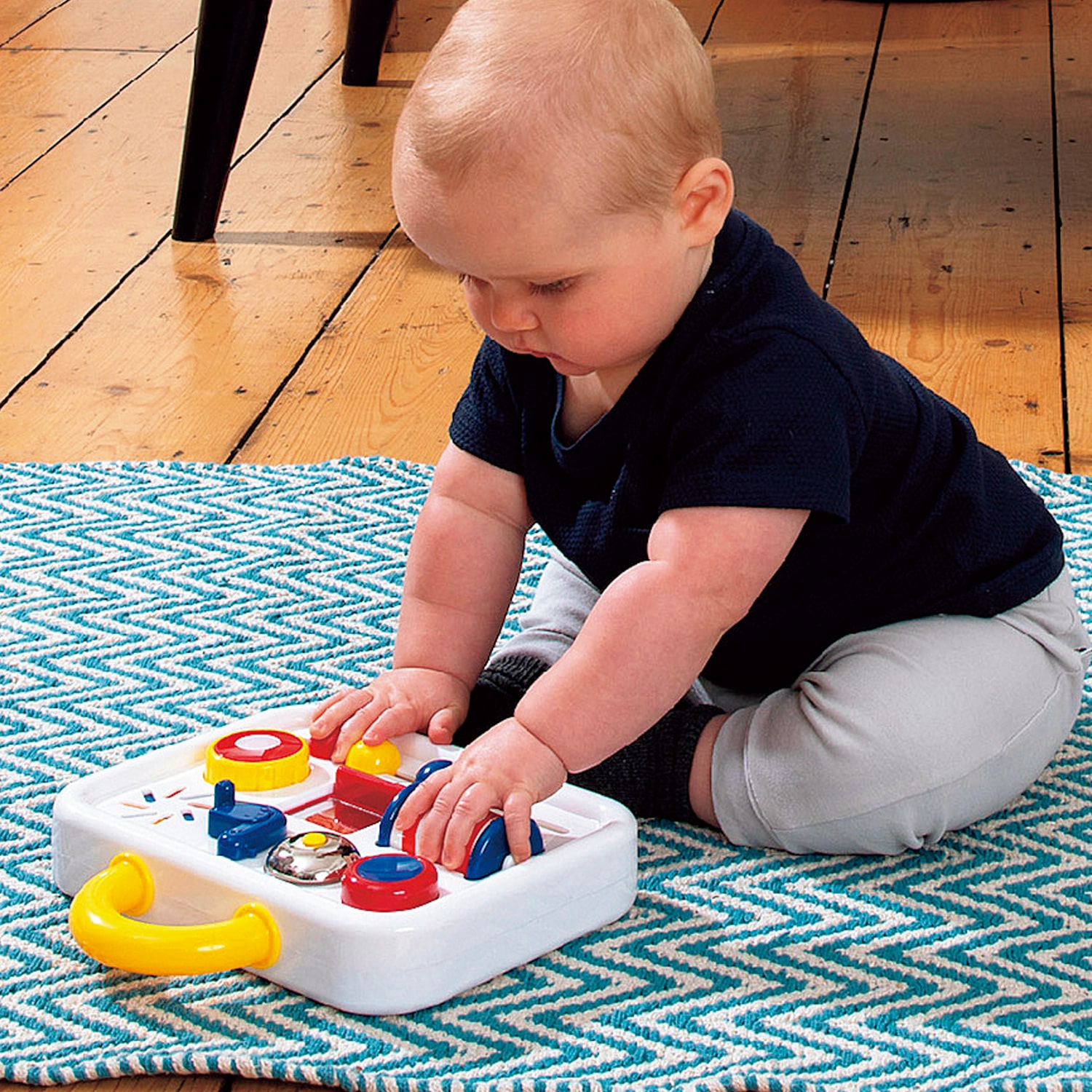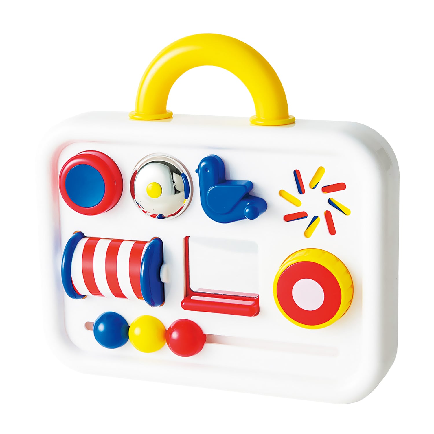 「アクティビティ・ケース」はボタンを押す、音を鳴らすなど、遊ぶことで目と手の協応動作と「原因と結果」の理解を促します。持ち運びやすいハンドル付きでおでかけにもぴったりです。