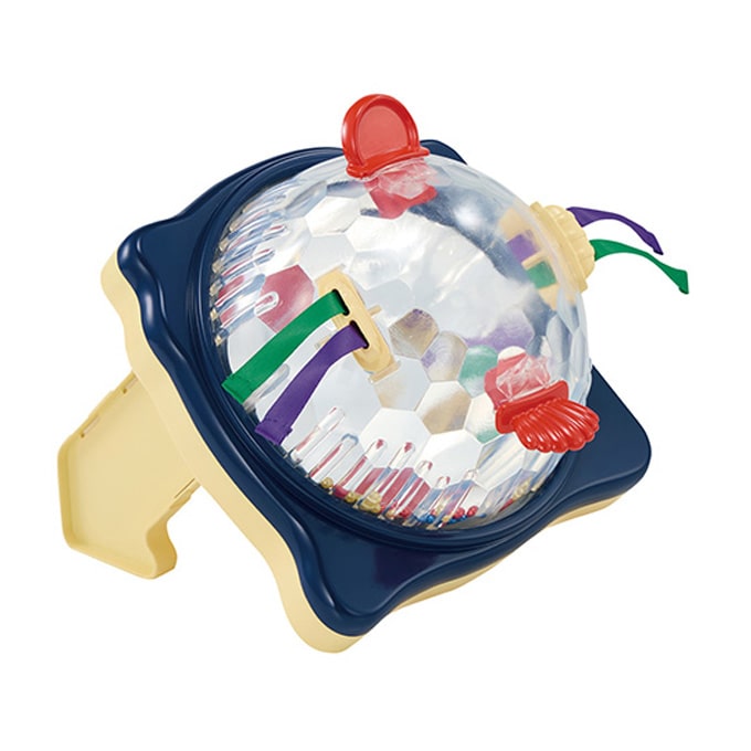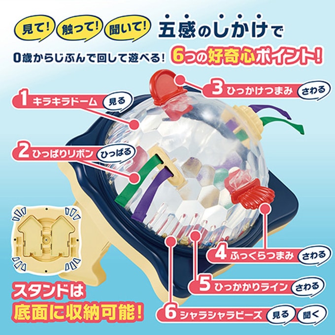 5感のしかけで、0歳から自分で回して遊ぶことができます。角度を変えれば、成長に合わせて遊べます。赤ちゃんの観察を通して赤ちゃんの回しやすい角度を研究!だからあお向け・横向き・うつ伏せでも自分で遊ぶことができます。