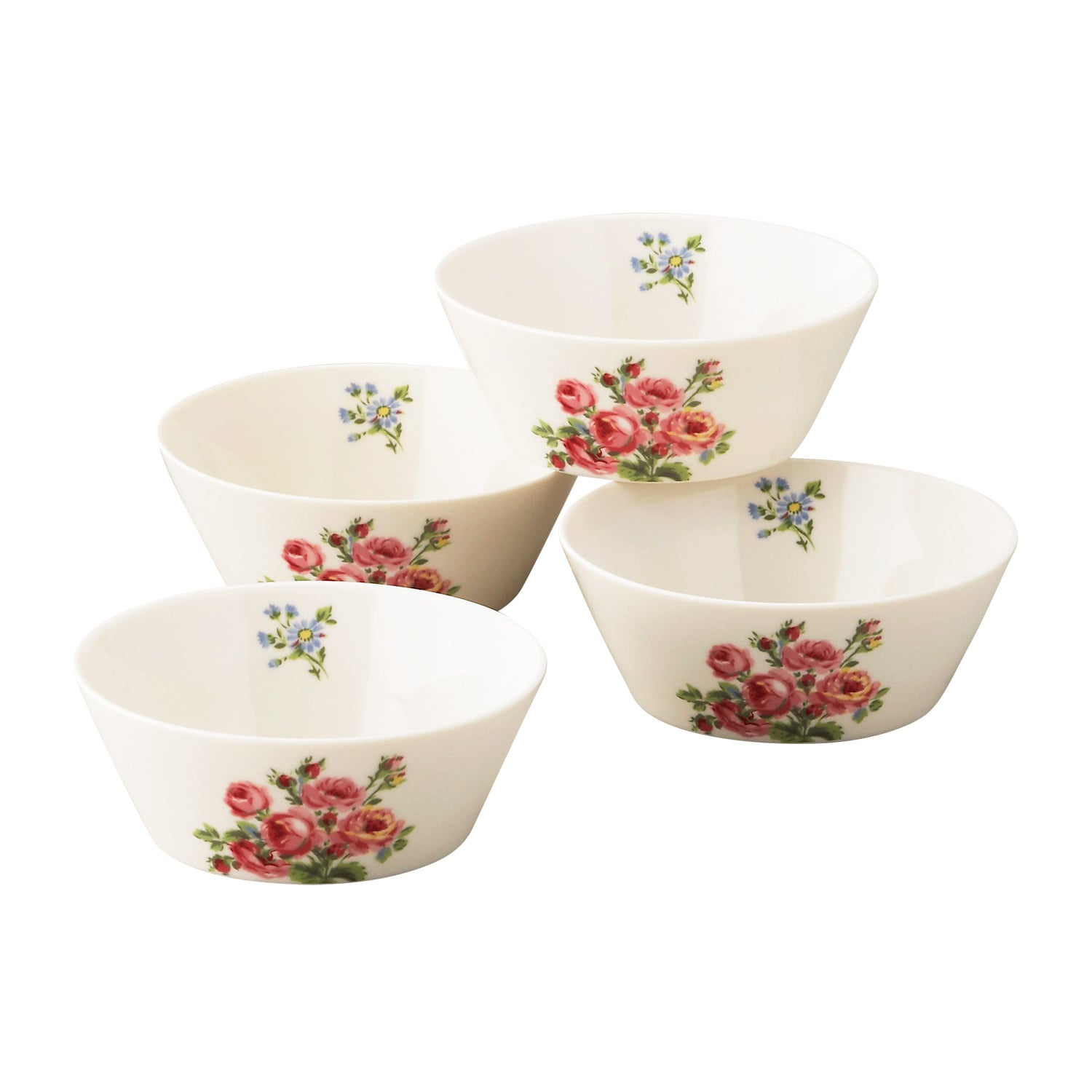 1953年にロンドンで設立された、オリジナルテキスタイルでライフスタイル提案をする〈ローラ アシュレイ〉のボウル4個セット。テーブルが華やかになります。