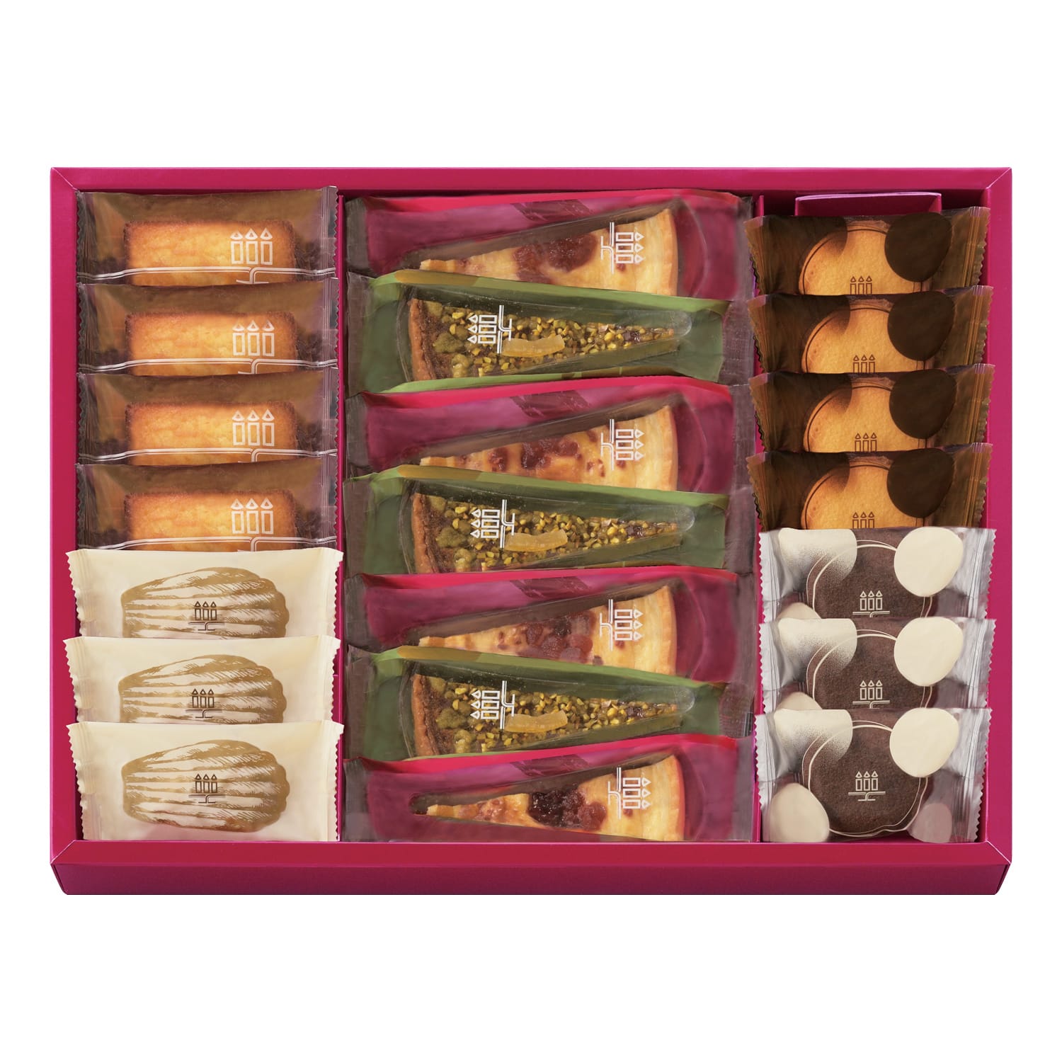 - 内容量:フィナンシェ・タルト フリュイ(フロマージュ フレーズ)×各4個、ラング ド シャ(プレーン)4枚、マドレーヌ・タルト フリュイ(ピスタチオ シトロン)×各3個、ラング ド シャ(チョコレート)3枚