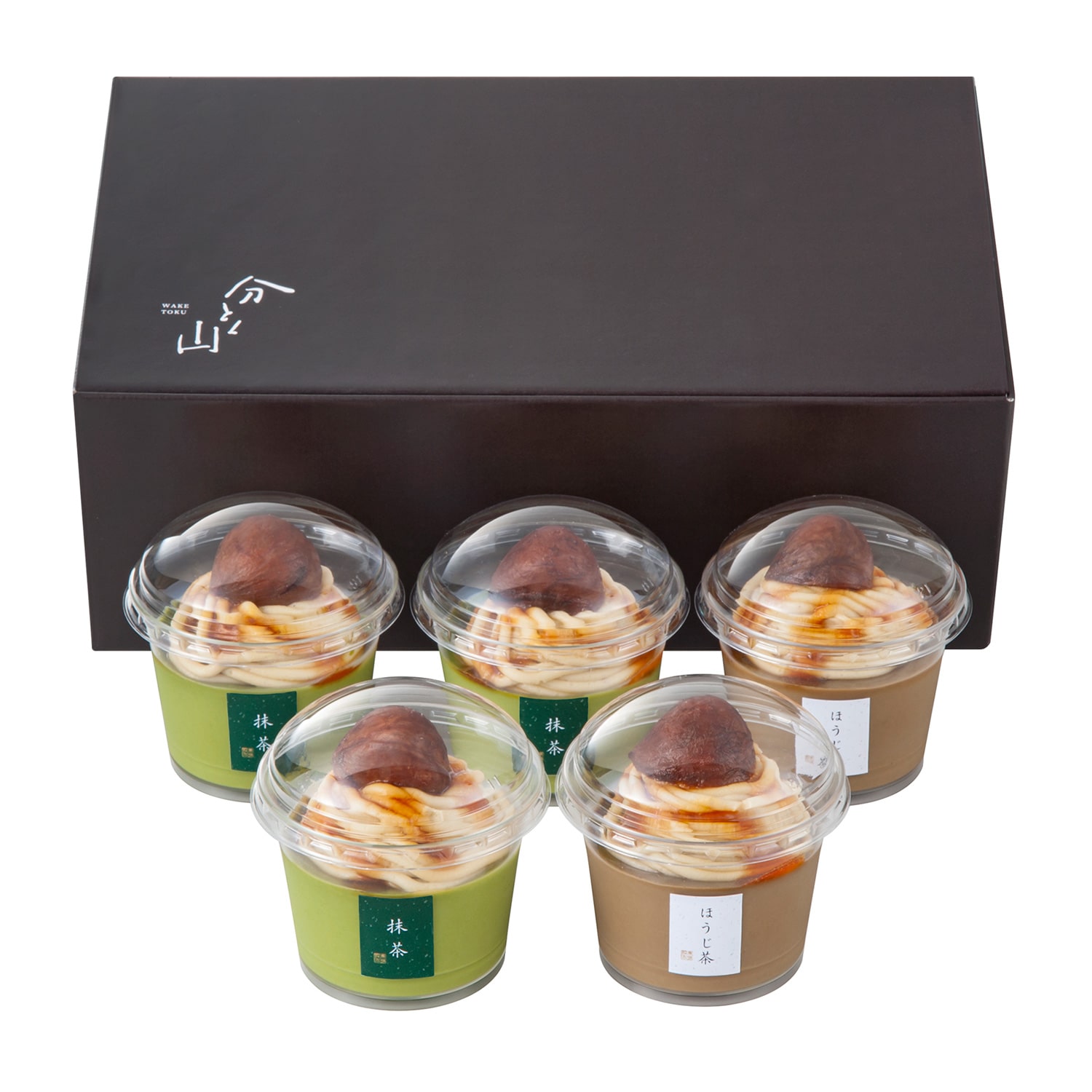 ほろ苦い香り豊かな抹茶プリンとまろやかで香ばしさが香るほうじ茶プリン。2種のプリンの上にモンブランクリームを絞り、栗をトッピング。温かい飲み物とご一緒にティータイムをお楽しみください。