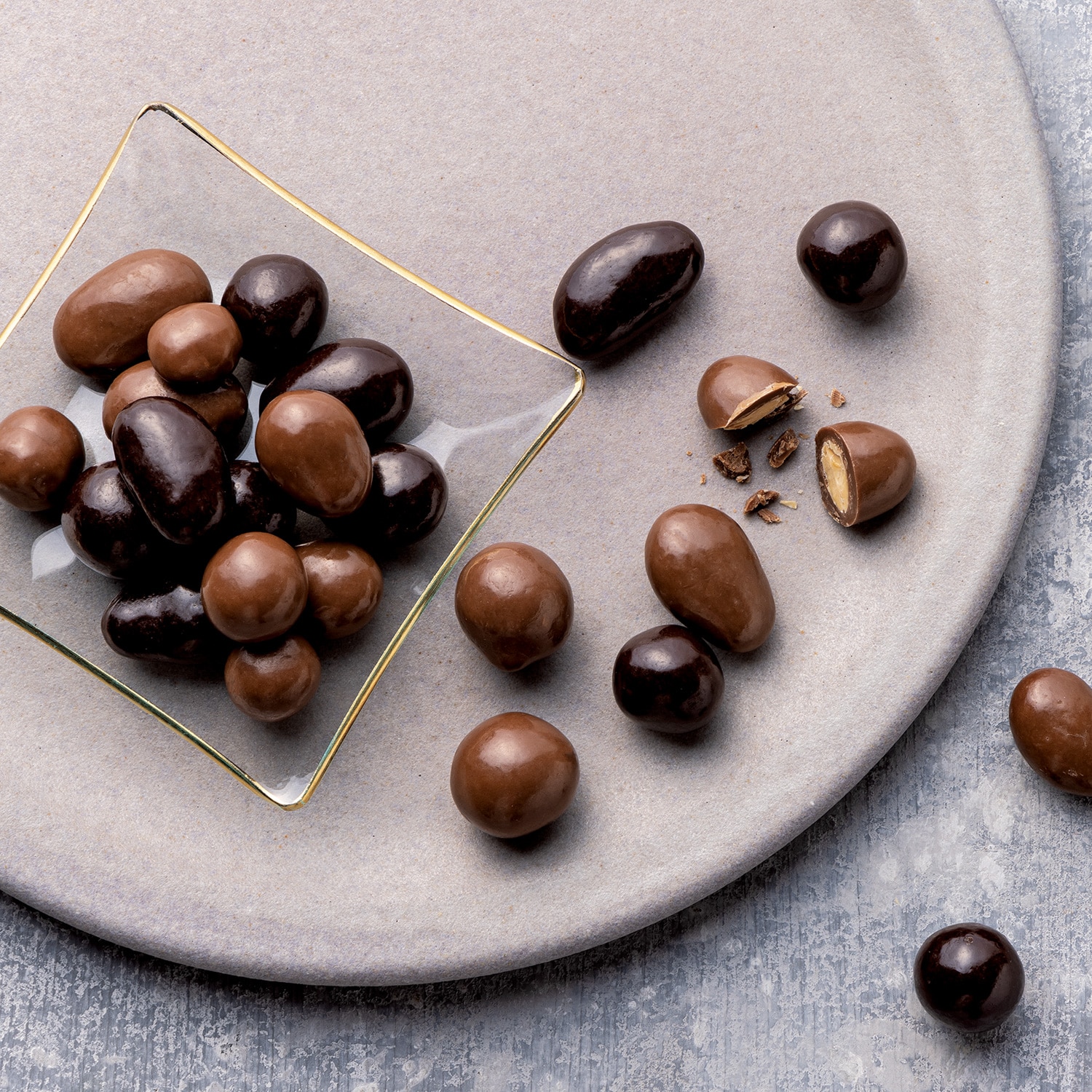 〈ピュイリカール〉は1967年、フランス・プロバンス地方のピュイリカール村に創業。全ての製品を自社アトリエで作り、多くの工程を手作業で行っています。長期保存のための冷凍保存を避けているのは、カカオの香りをそのまま届けたいという思いから。フランス政府が、国の伝統と技を忠実に守り継承している企業に与える称号『EPV』を、食品業界では第一号として授与されています。このチョコレートボールはミルクチョコレートとダークチョコレートでナッツを包んだ香り高いチョコレート菓子です。