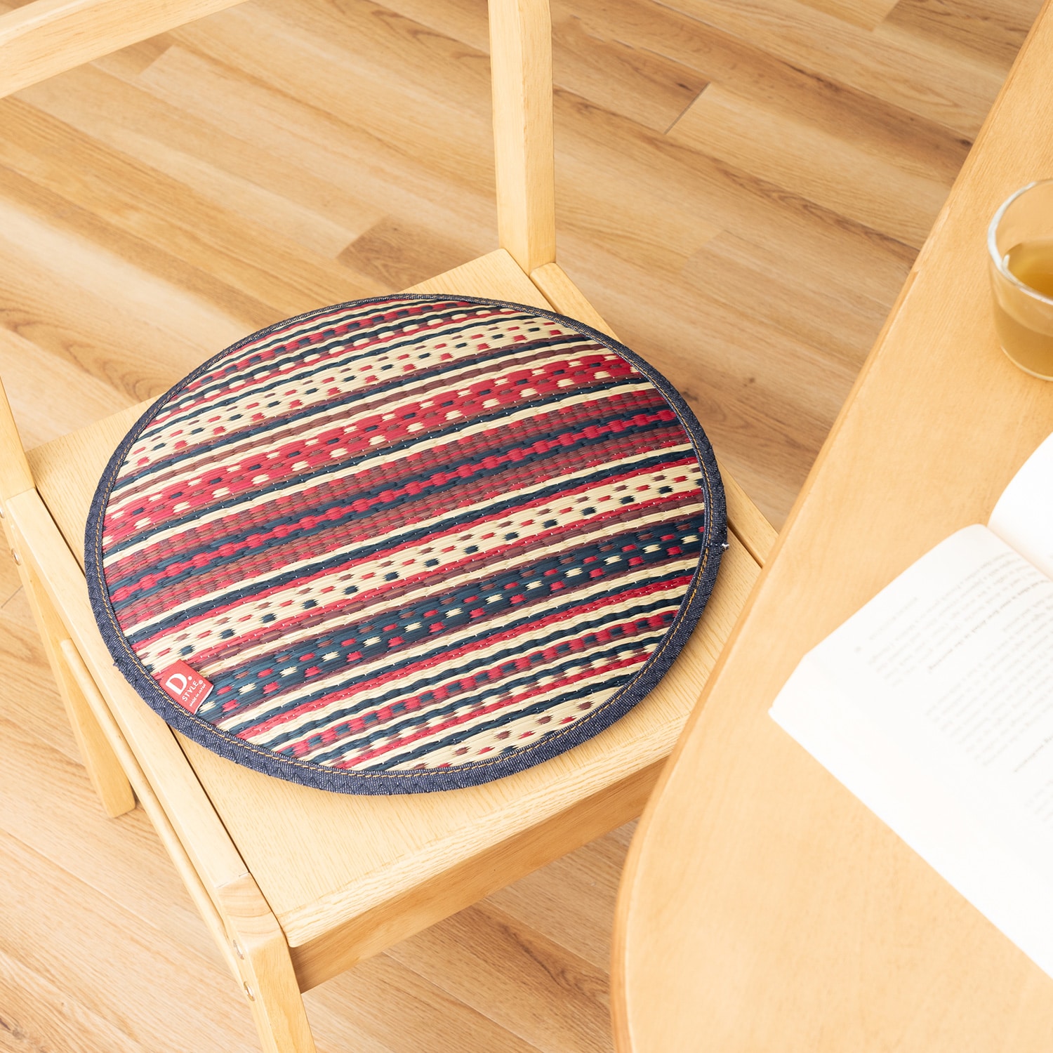 デザインは洋室にも合わせやすいカジュアルで仕上げ、明るいカラーで色をつけました。裏地、ヘリ部分にデニム生地を使用したチェアパッドです。椅子の形に合わせた円形クッションで、デスクチェアやダイニングチェアなどでお使いください。