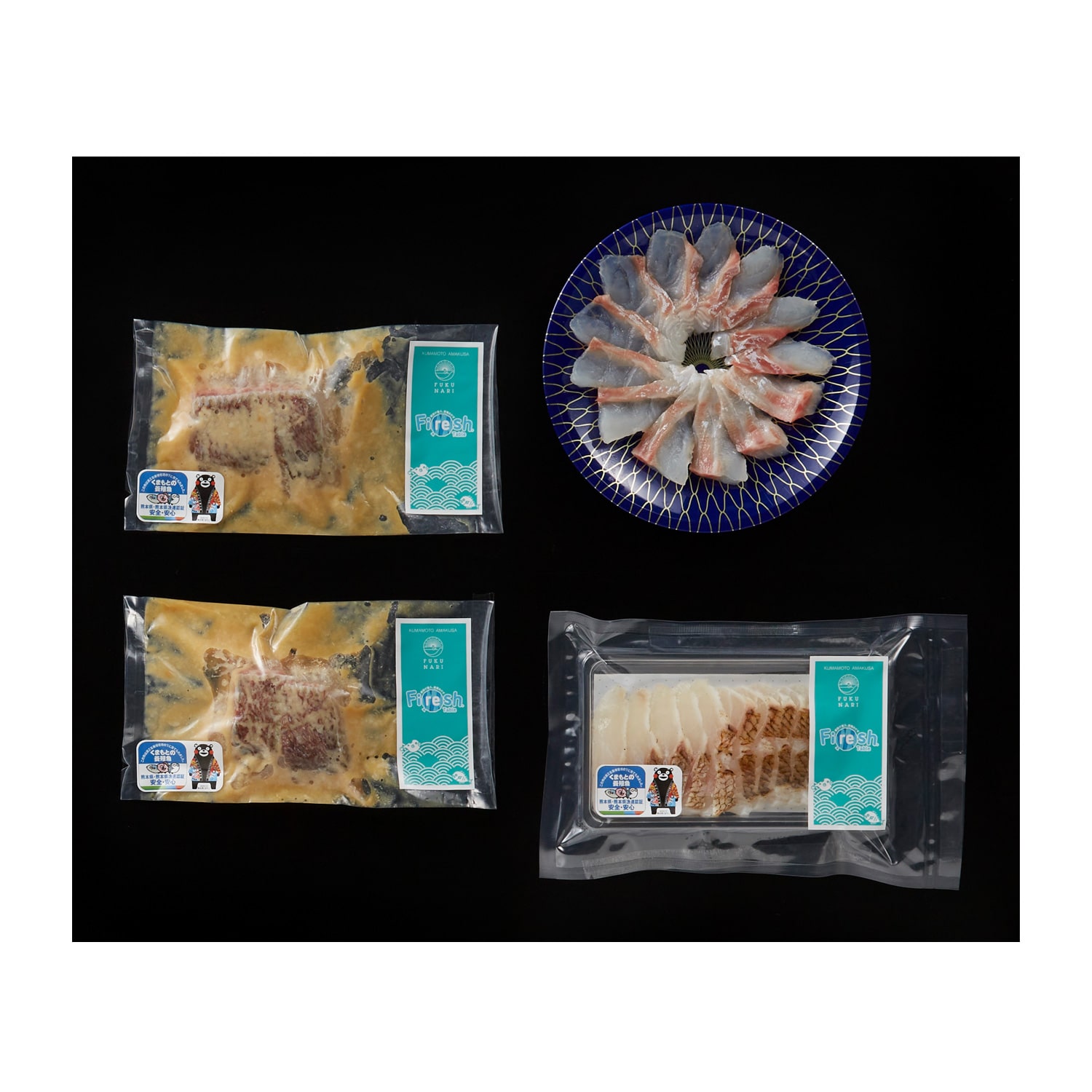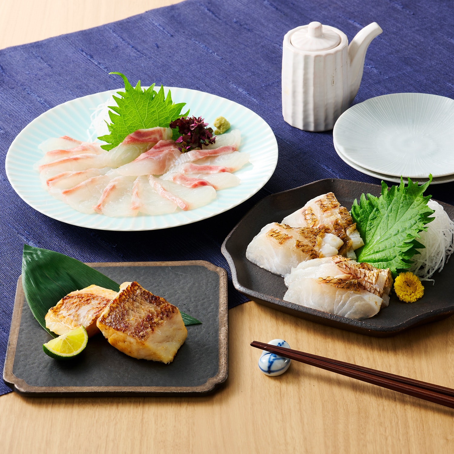 - 真鯛西京漬(2切)計100g×2、真鯛刺身(1皿)・真鯛炙り刺身各100g/真鯛(養殖):熊本県産