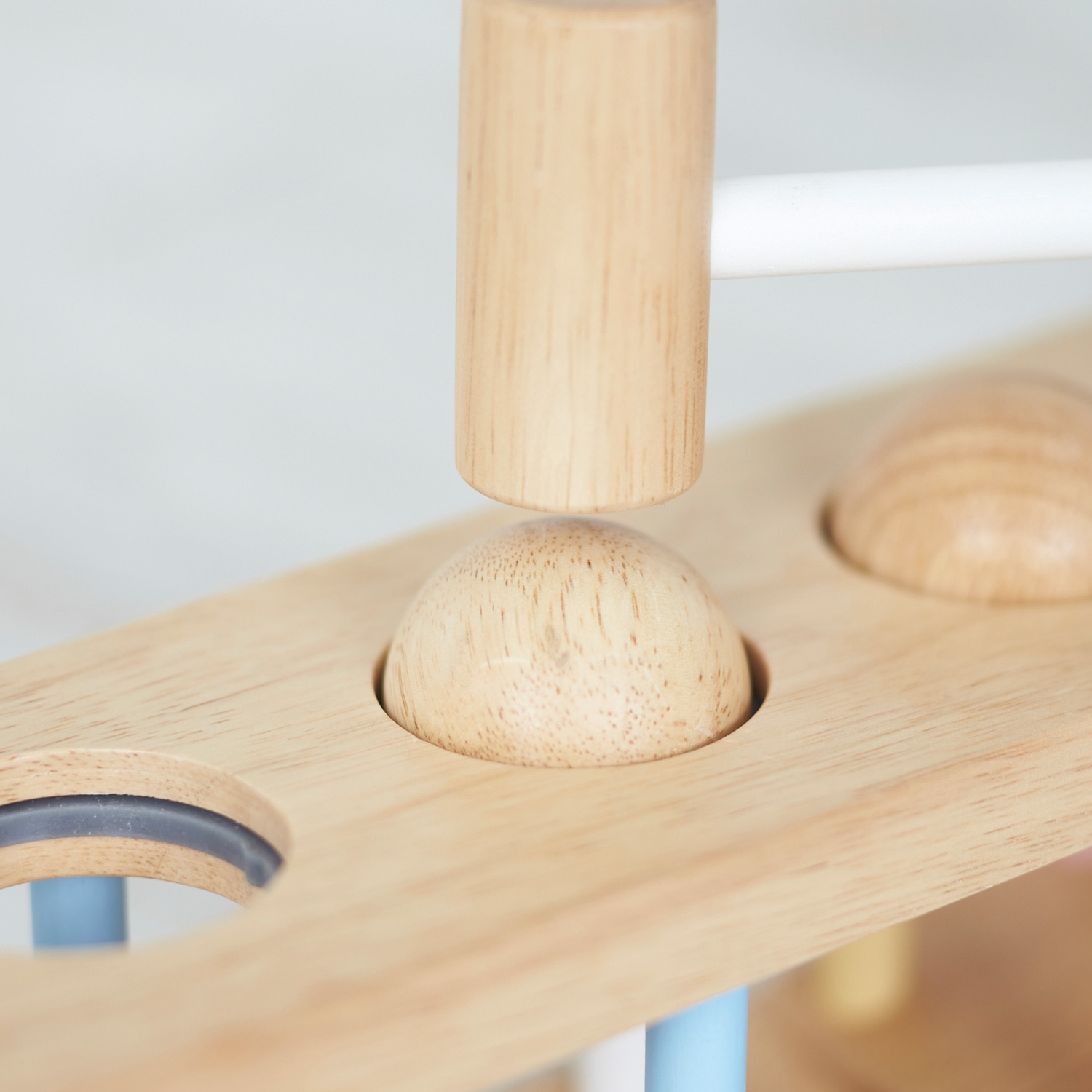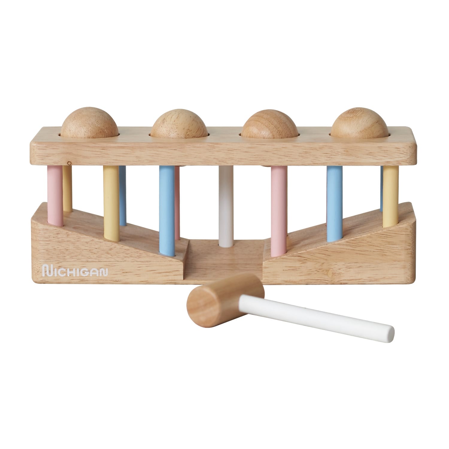 - サイズ(約):本体=(幅29.5×奥行9.5×高さ11cm)×1、ボール=(直径4.5cm)×4、ハンマー=(全長15cm)×1/材質:天然木、シリコーン/対象年齢1.5歳以上/ベトナム製