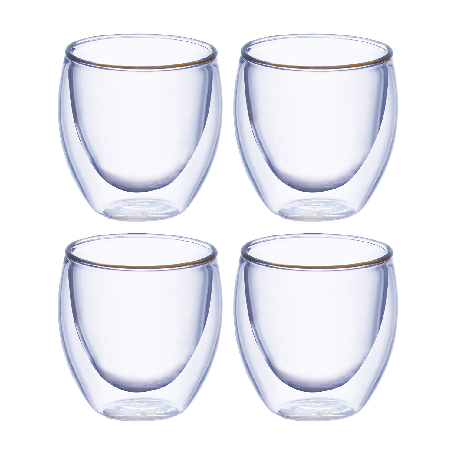 ダブルウォールドリンクグラスのセット。温かい飲みものは温かく、冷たい飲みものは冷たく保ちます。スープや冷たいデザートにもお使いいただけます。