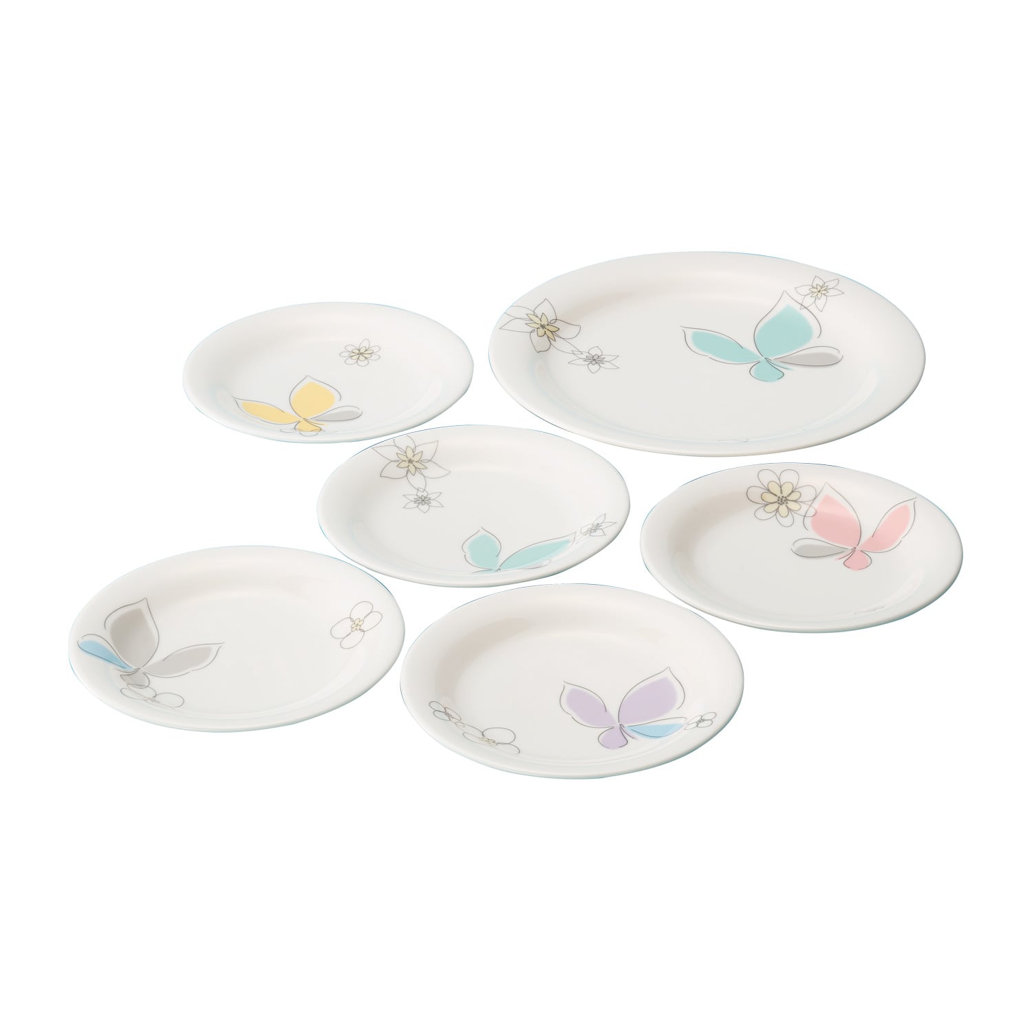 ハナエモリのシンボルマークでもある蝶が優雅に描かれた大小のプレートセット。上品なデザインで大切なお客様のおもてなしやホームパーティーに活躍します。
