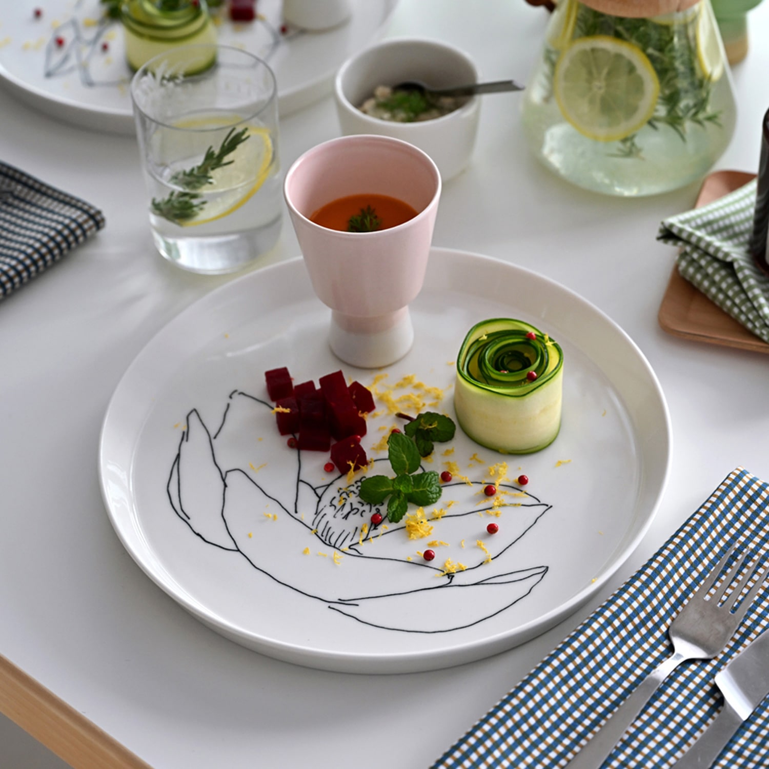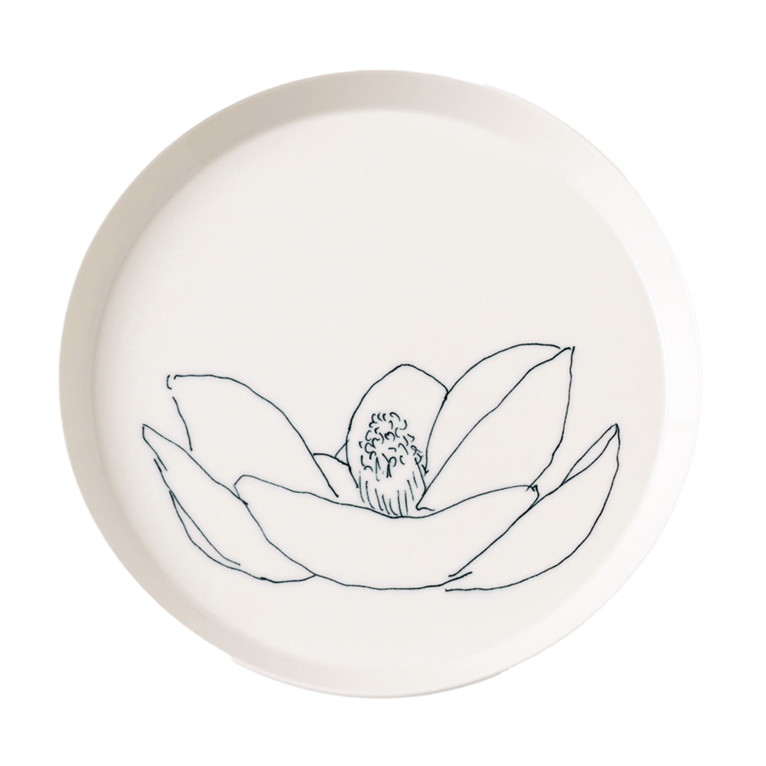 石本藤雄氏デザインによる、マグノリアのドローイングプレート。存在感がありながらもシンプルに仕上がっているので、どんなお料理にもお使いいただけます。24cmと大きめなので、複数のおかずを盛り付けたり、3~4人でシェアするようの盛皿にしたりとパーティーシーンで大活躍しそうです。