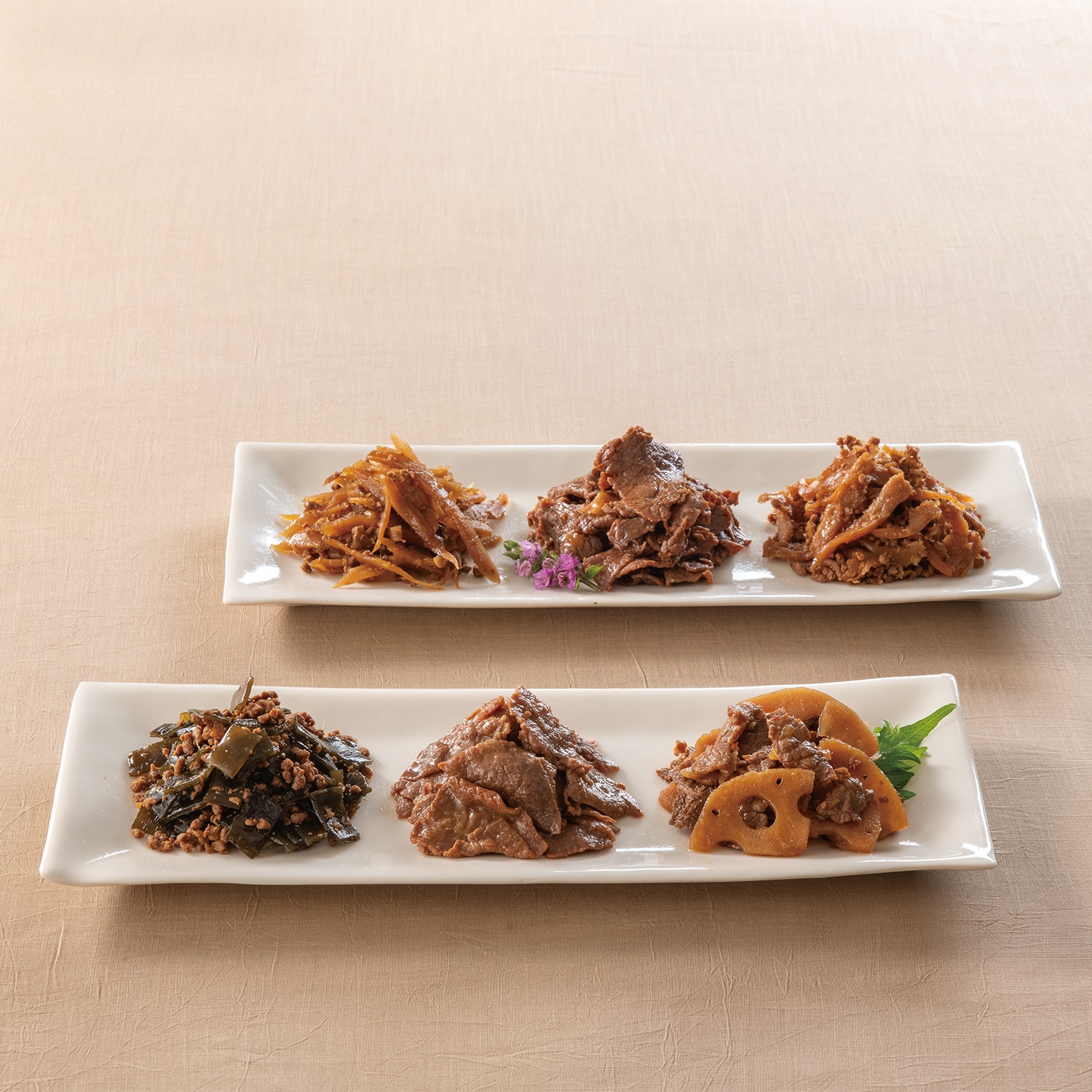 - 牛肉すきやき・牛肉れんこん・牛肉こんぶ・牛肉やわらか煮・牛肉ごぼう・牛肉まいたけ各55g