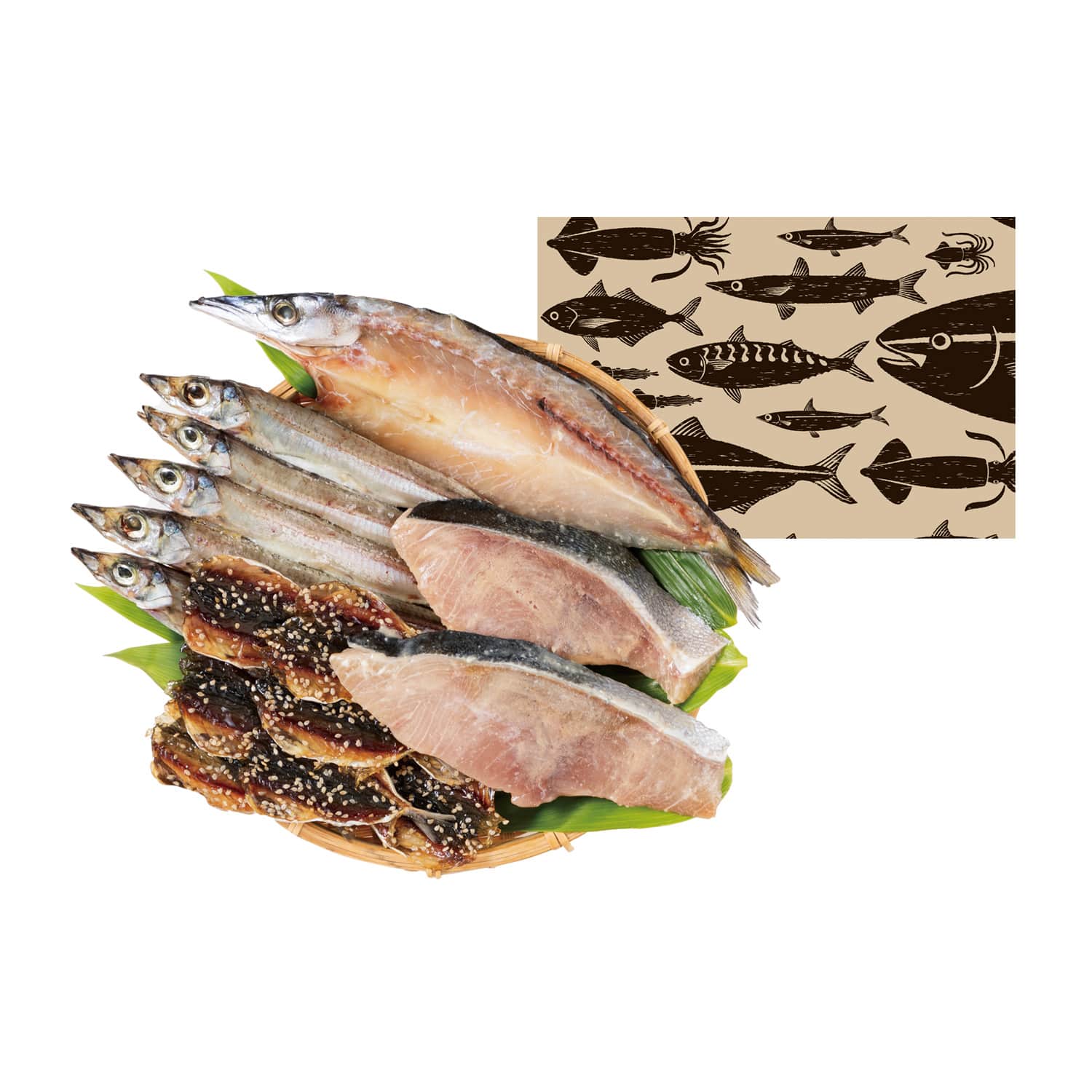 - かます開き1枚、氷見ぶり西京漬・氷見ぶり粕漬×各1切、あじみりん干し80g、ニギス丸干し5尾/かます・ぶり・ニギス・あじ:富山県産