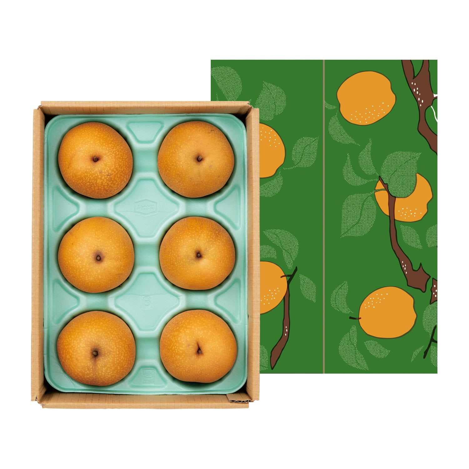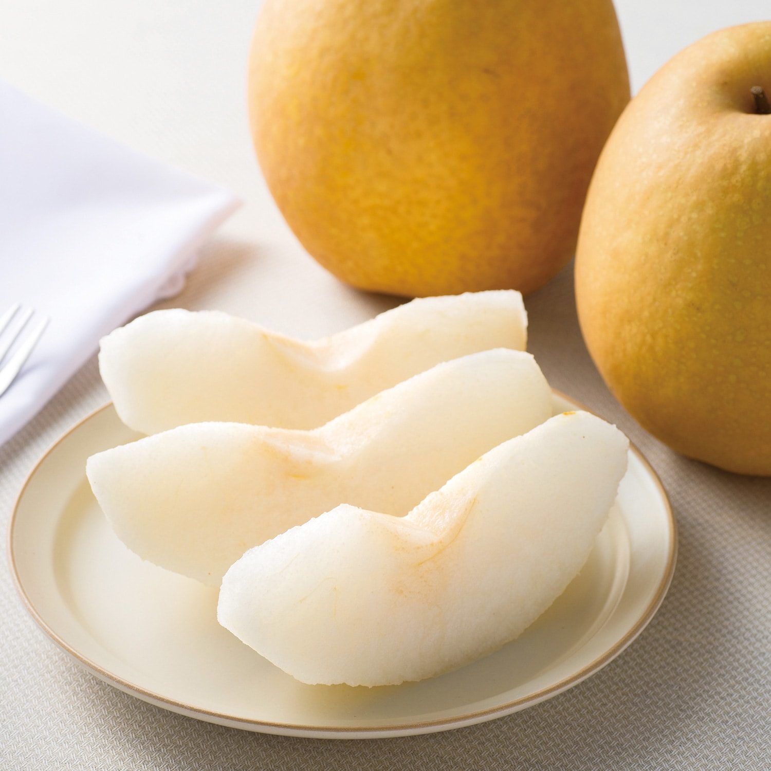100年以上の梨栽培の歴史を誇る鳥取県で、2003年に登録された赤梨の最新品種。「二十世紀」と中国梨「慈梨」を掛け合わせたものに、ジャンボ梨の「新雪」を交配させて生まれた晩成の梨で、毎年11月下旬~12月下旬にお届けできる希少品です。果肉は白く緻密で、やわらか。酸味と甘みが絶妙でみずみずしく、割ると芳醇な香りが漂います。常温で1カ月、冷蔵なら2~3カ月と日持ちがよいのも特徴。少しずつ変わる味の変化もぜひお楽しみください。