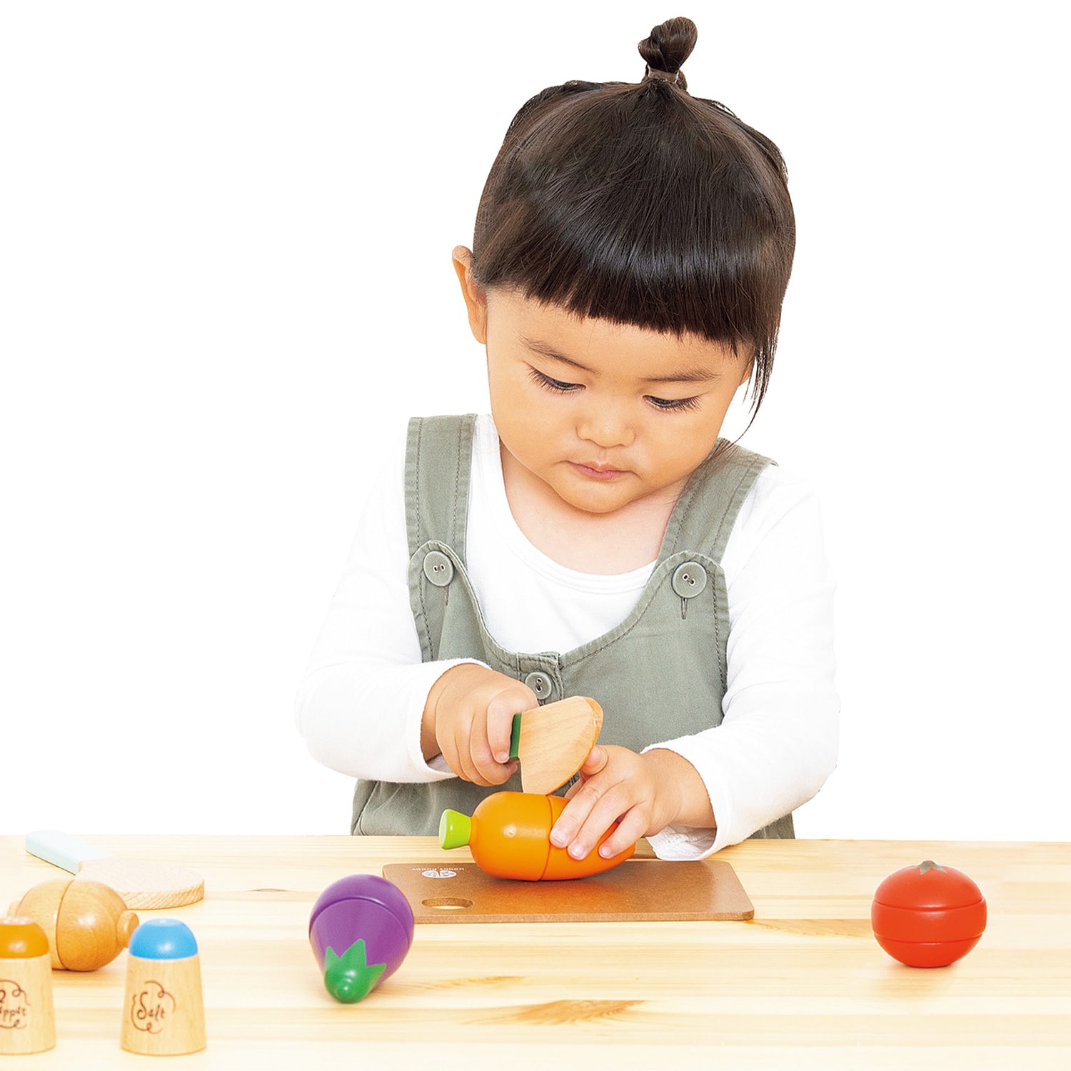 野菜と調理器具、調味料が入ったセットです。野菜はマグネットでつけ外しができ、切り口までデザインにこだわってます。食材を切ったり煮込んだりする楽しみから食への興味にもつながります。
