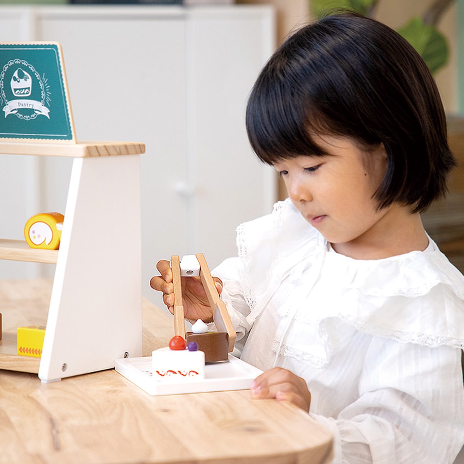 15種類のスイーツを並べてケーキ屋さんごっこが楽しめます。 トングは滑りにくいシリコンを埋め込み、つかみやすい仕様です。