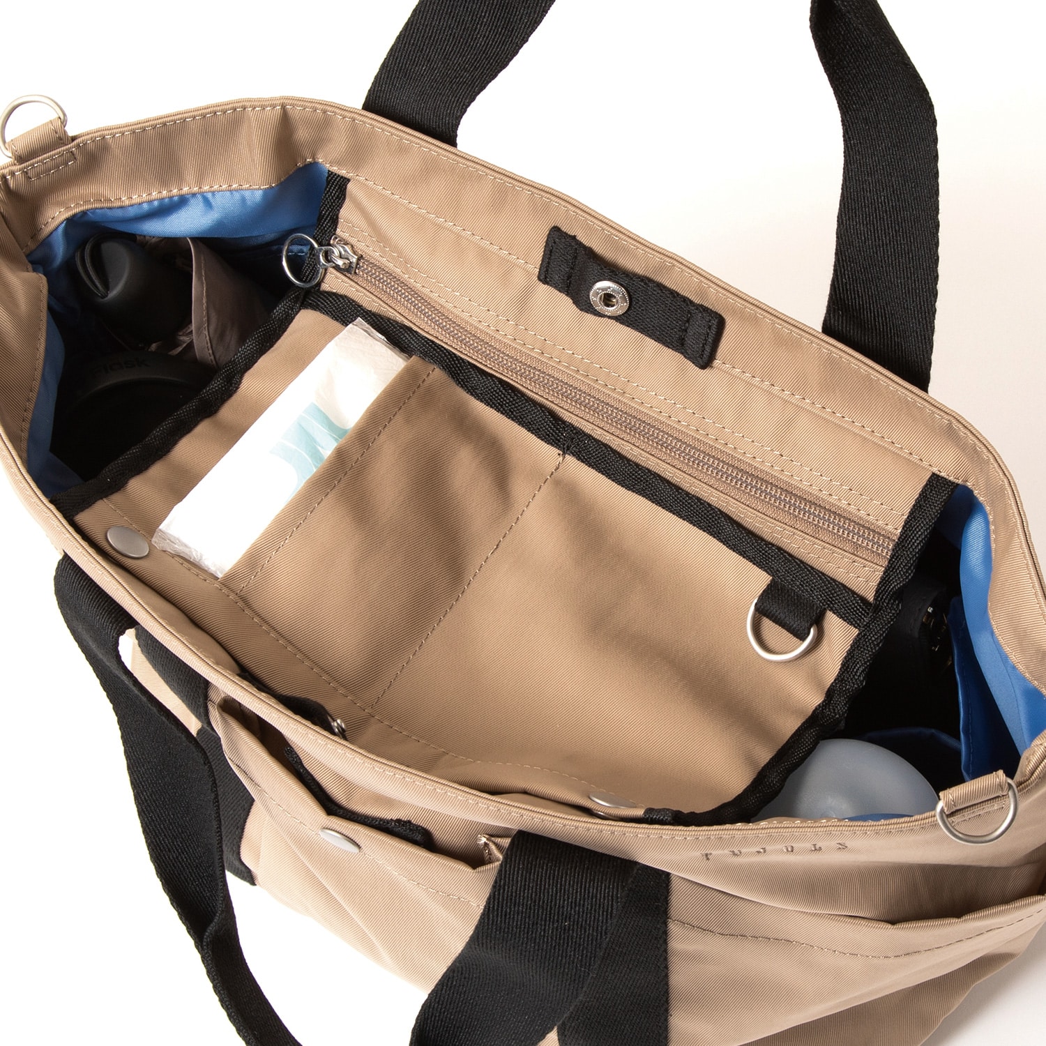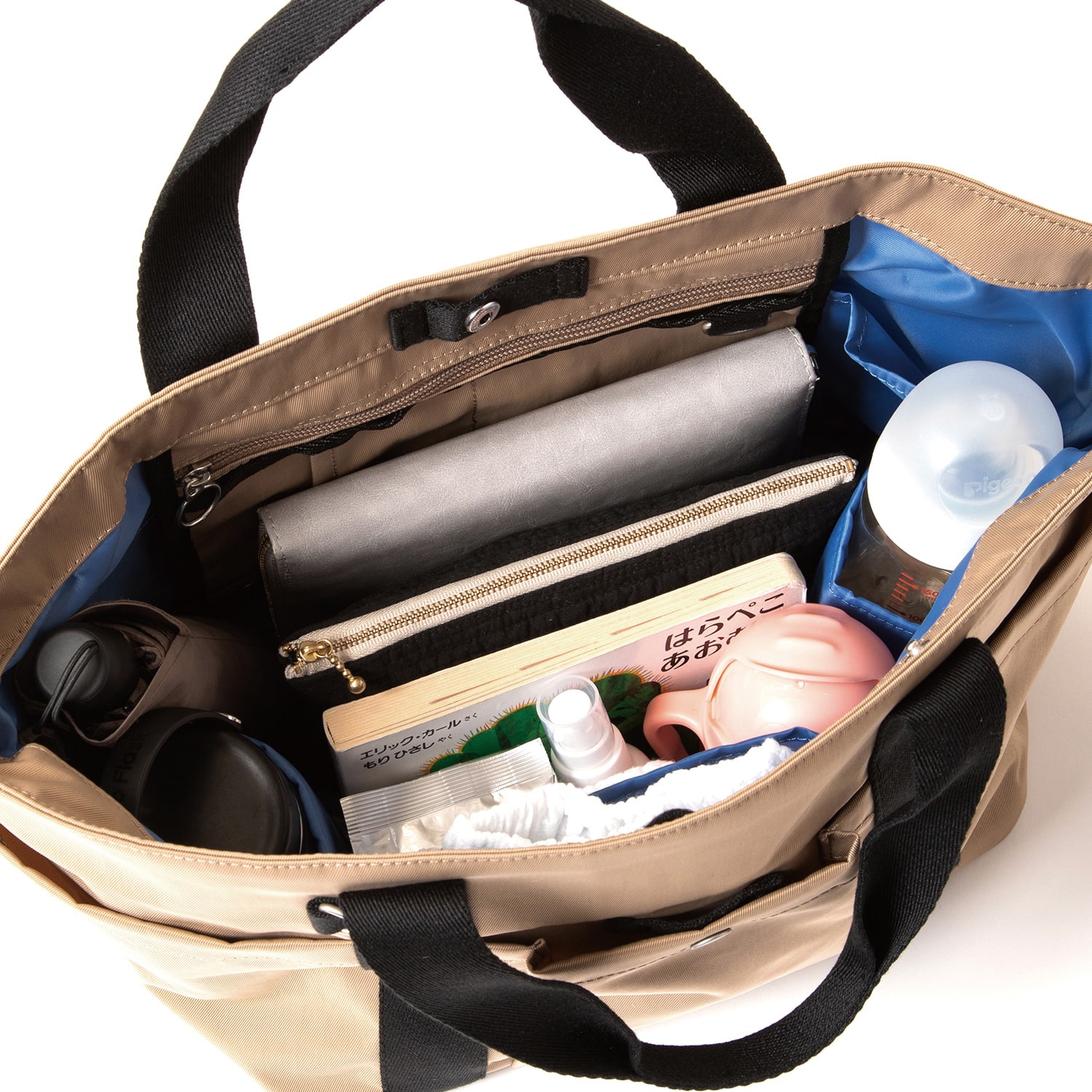 持つ人を選ばないシンプルなデザインのマザーズバッグです。荷物が少ない時にはホックで止めることができ、荷物が多い時には内ポケットをフタにすることで中身の丸見えを防ぐことができます。