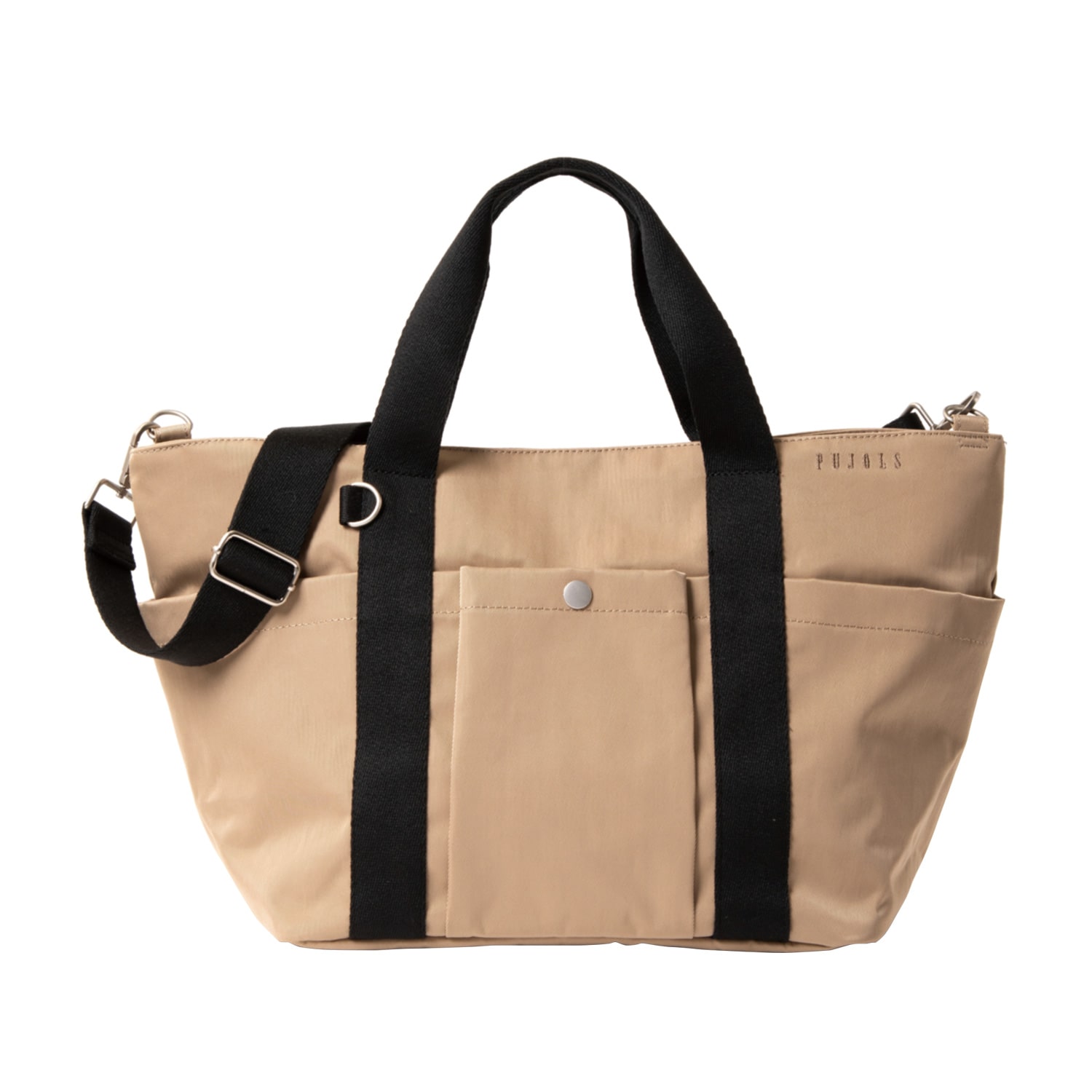 - サイズ(約):28×32(最大幅48)×マチ20cm/重量(約):570g/素材:ナイロン/仕様:ホック開閉、外=ホックポケット×1・オープンポケット×2、内=ファスナーポケット・ティッシュ用ポケット×各1・オープンポケット×7・ドリンクホルダー×2、ショルダーベルト着脱式/中国製