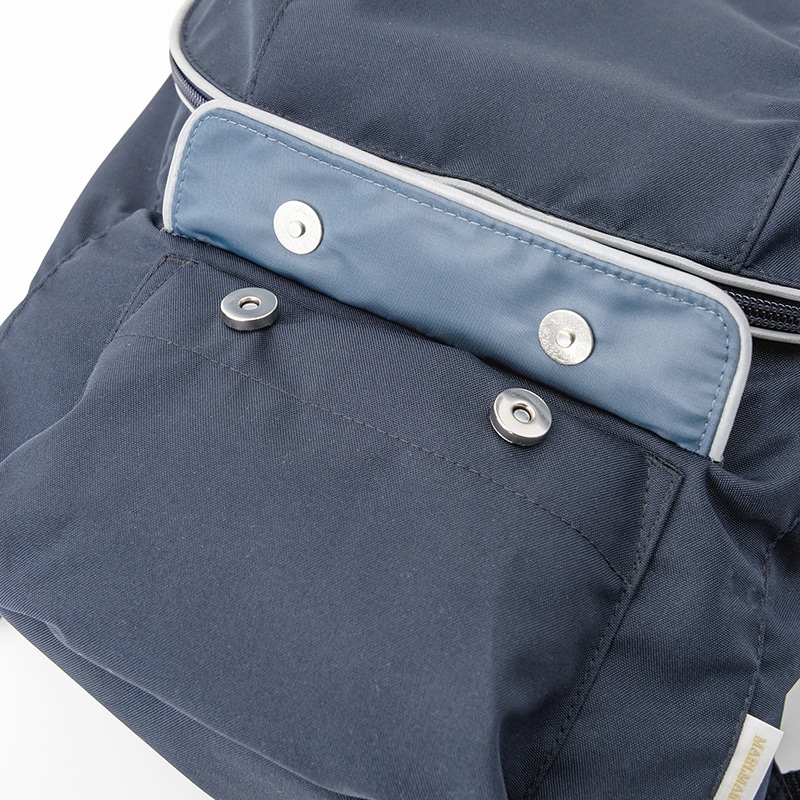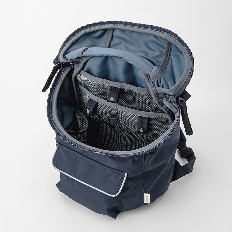 入園・入学・習いごとなど、新しい世界へ飛び込んで行く子どもたちへMARLMARLが贈るスクールグッズシリーズ。丸みを帯びたフォルムがキュートなデイパックです。自立する設計と大きく開くU字カーブ状フタで、荷物を出し入れしやすく、ファスナー両端のタグは滑らかな開閉をサポートします。パイピングは反射機能付き。暗い場所でもしっかり光って安心です。