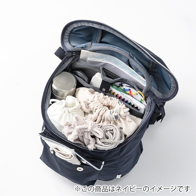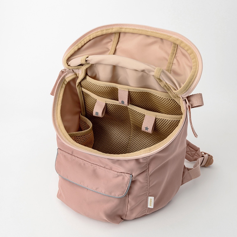 入園・入学・習いごとなど、新しい世界へ飛び込んで行く子どもたちへMARLMARLが贈るスクールグッズシリーズ。丸みを帯びたフォルムがキュートなデイパックです。自立する設計と大きく開くU字カーブ状フタで、荷物を出し入れしやすく、ファスナー両端のタグは滑らかな開閉をサポートします。パイピングは反射機能付き。暗い場所でもしっかり光って安心です。