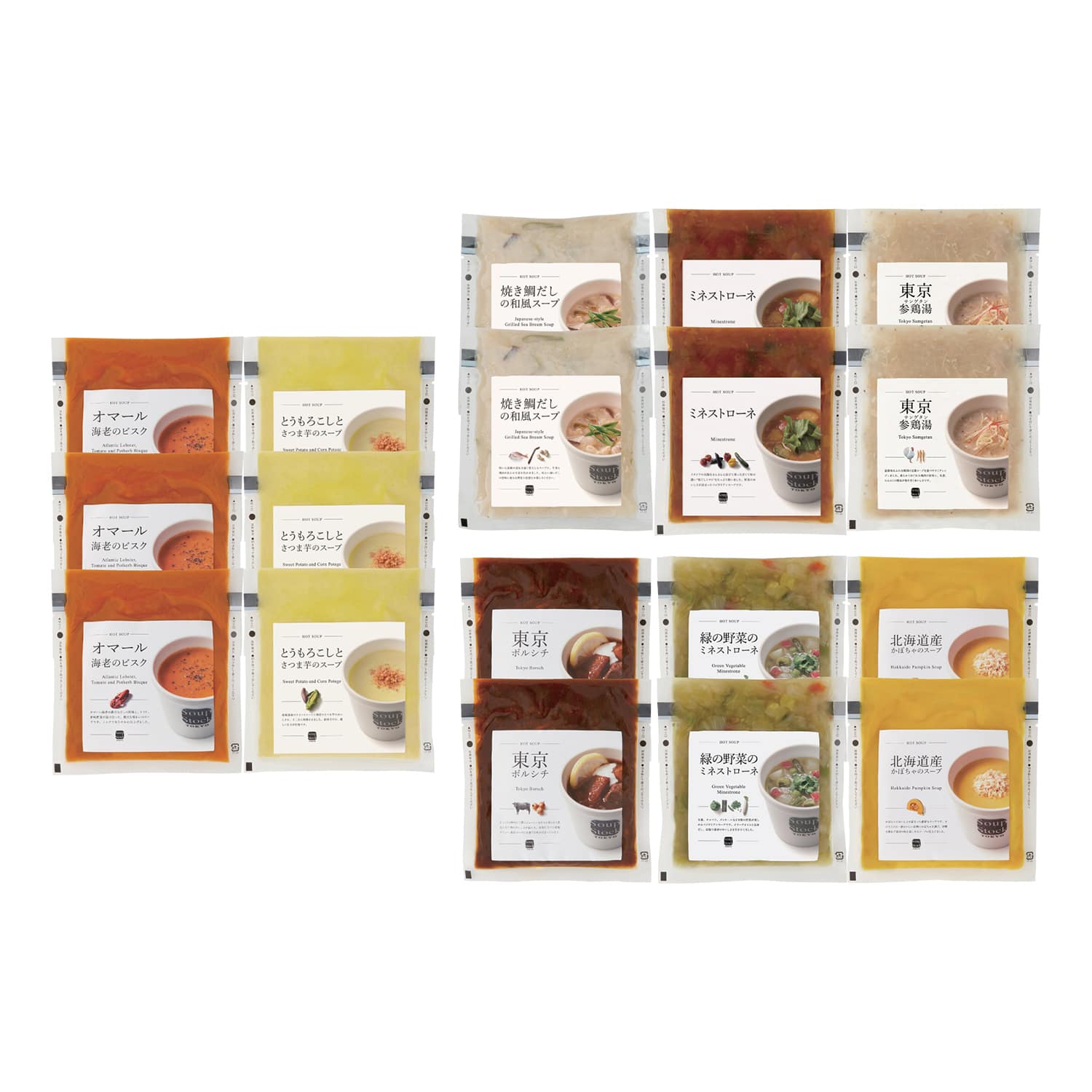 - 内容量:オマール海老のビスク・とうもろこしとさつま芋のスープ各180g×3、焼き鯛だしの和風スープ・ミネストローネ・東京参鶏湯・東京ボルシチ・緑の野菜のミネストローネ・北海道産かぼちゃのスープ各180g×2