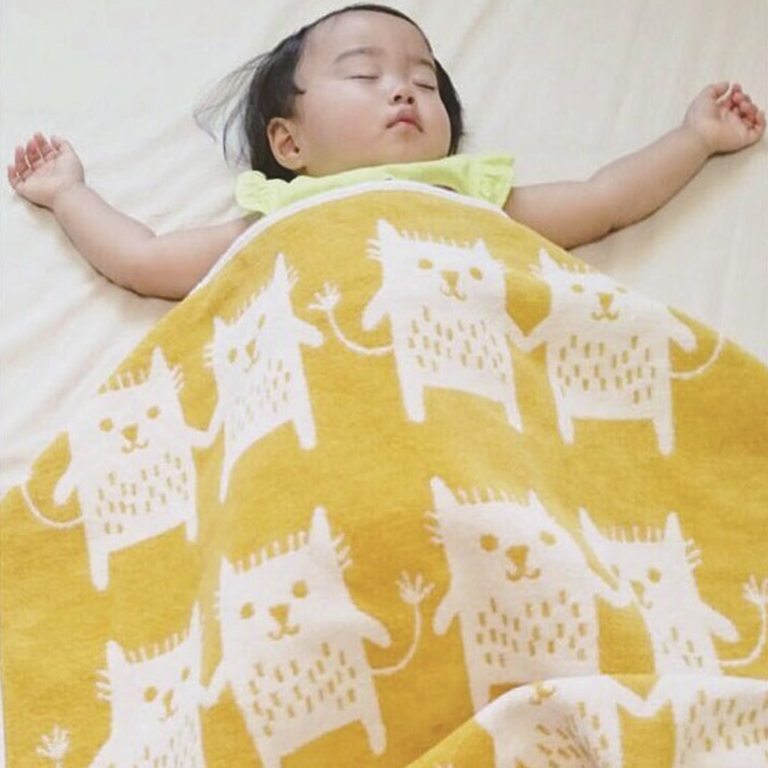 北欧らしいカラーリングに、可愛らしいボブキャット柄のミニブランケット。表裏でカラーリングが反転するリバーシブル仕様です。オーガニックコットン100%で、やさしい肌さわり。洗濯機でも丸洗いができるため、お手入れも簡単で清潔にお使いいただけます。