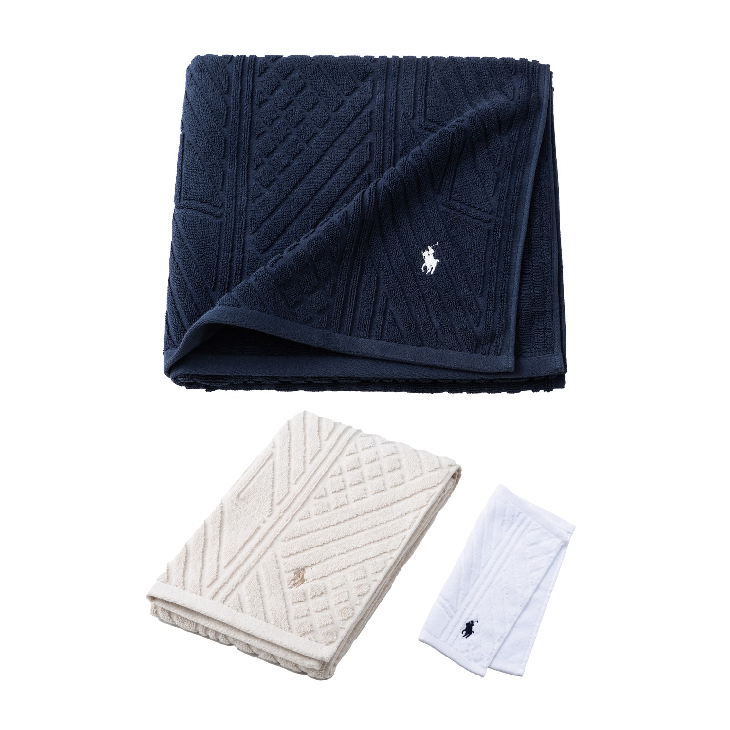 サイズ(約):ミニタオル(ホワイト)=(25×25cm)、ハンドタオル(オートミール)=(34×85cm)、バスタオル(ネイビー)=(65×120cm)/素材:綿100%/ベトナム製