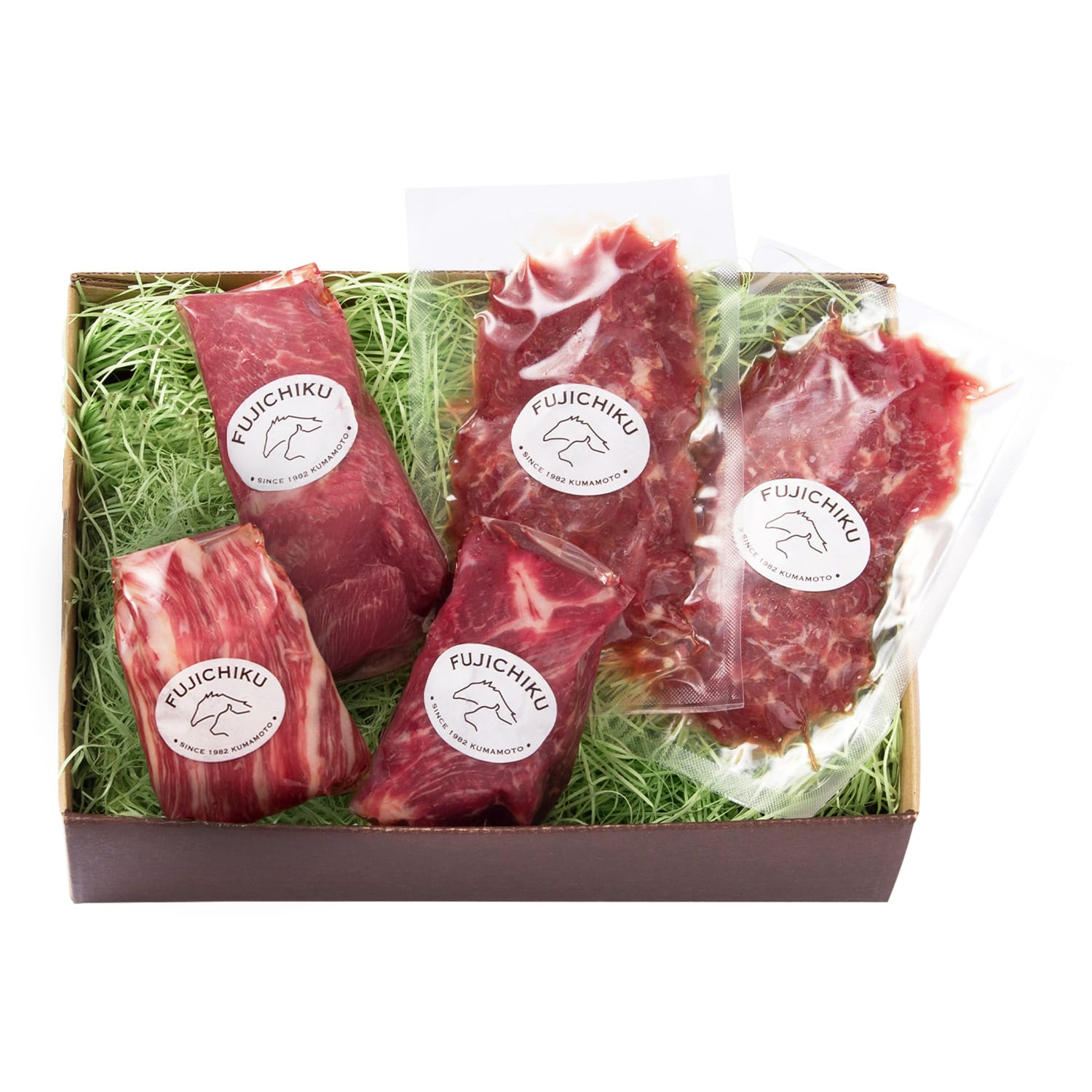 馬刺しの本場・熊本の自社牧場育ち、自社加工の鮮度の良い馬刺し。熊本馬刺しの醍醐味「霜降り」馬刺し大トロはとろける様な食感で豊かなサシの甘みが赤身の旨みを引き立てます。1番人気の上赤身はモチっとしながら歯切れの良さ、上級赤身ロースは柔らかな食感と赤身特有の旨みが特徴。さらに今では貴重となったユッケは、鮮度の良い馬肉を100%使用し自社独自配合で馬刺しとは違った食感、香りが特徴。本場の味をお楽しみいただける詰合せです。