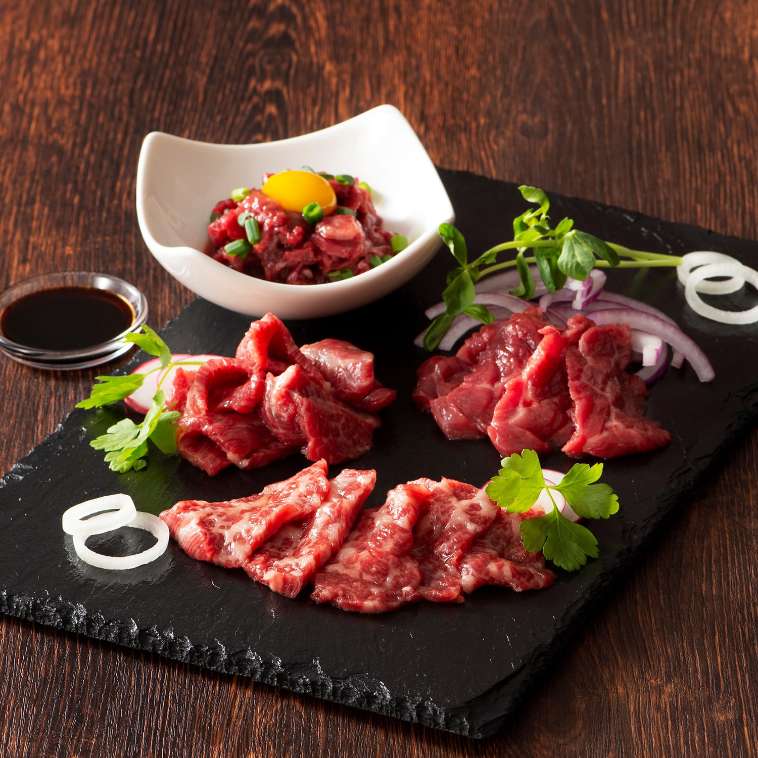 - 大トロ・ロース・上赤身各80g、ユッケ50g×2、馬刺しのたれ5ml×6、生姜3g×6、ユッケのたれ10g/馬肉:カナダ・フランス・国産