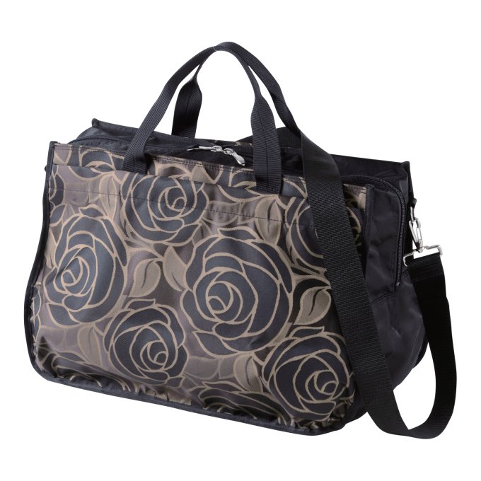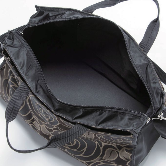光沢感のある薔薇柄のジャカード生地を使用したボストンバッグ。ポケットも充実しており、整理して荷物を収納できます。