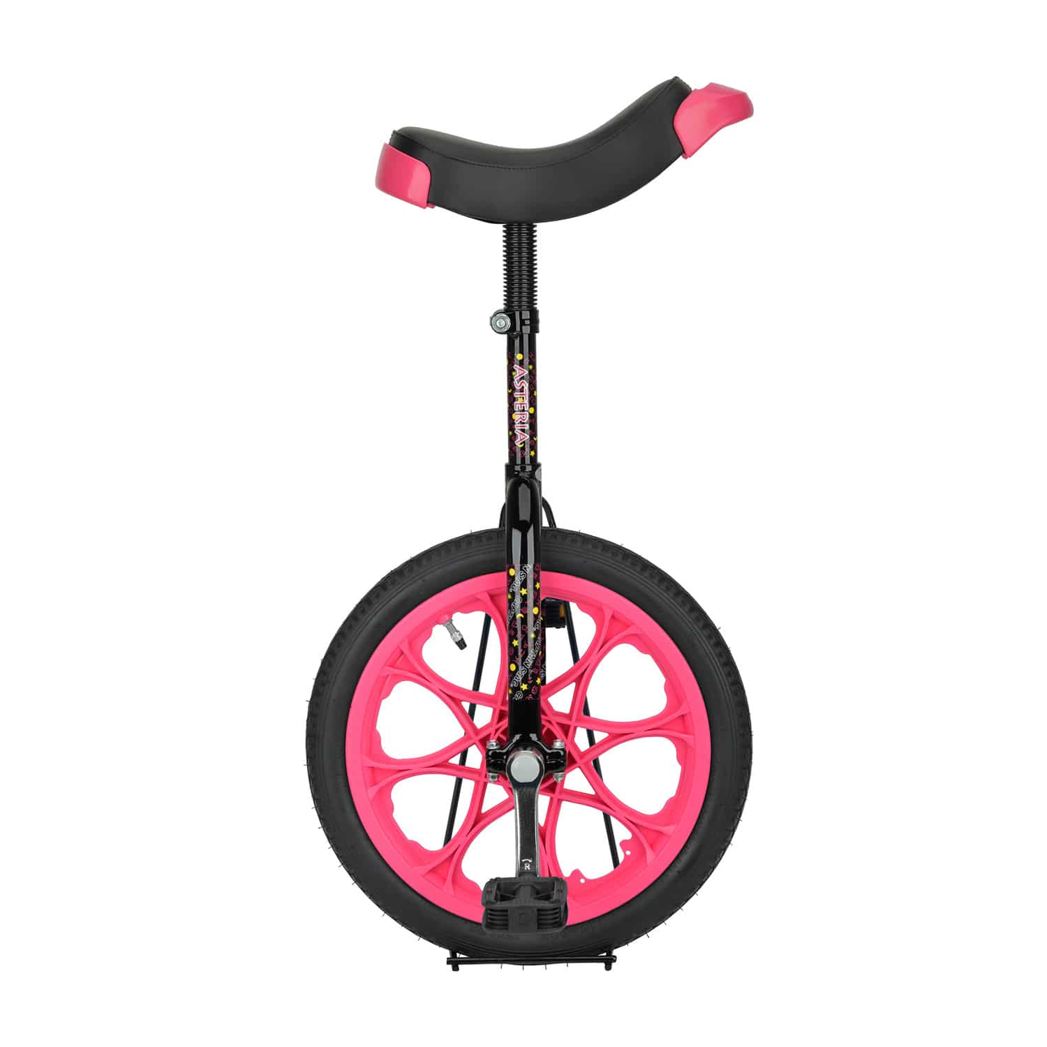 ポップなカラーが可愛い一輪車。保管に便利なスタンド付きです。
