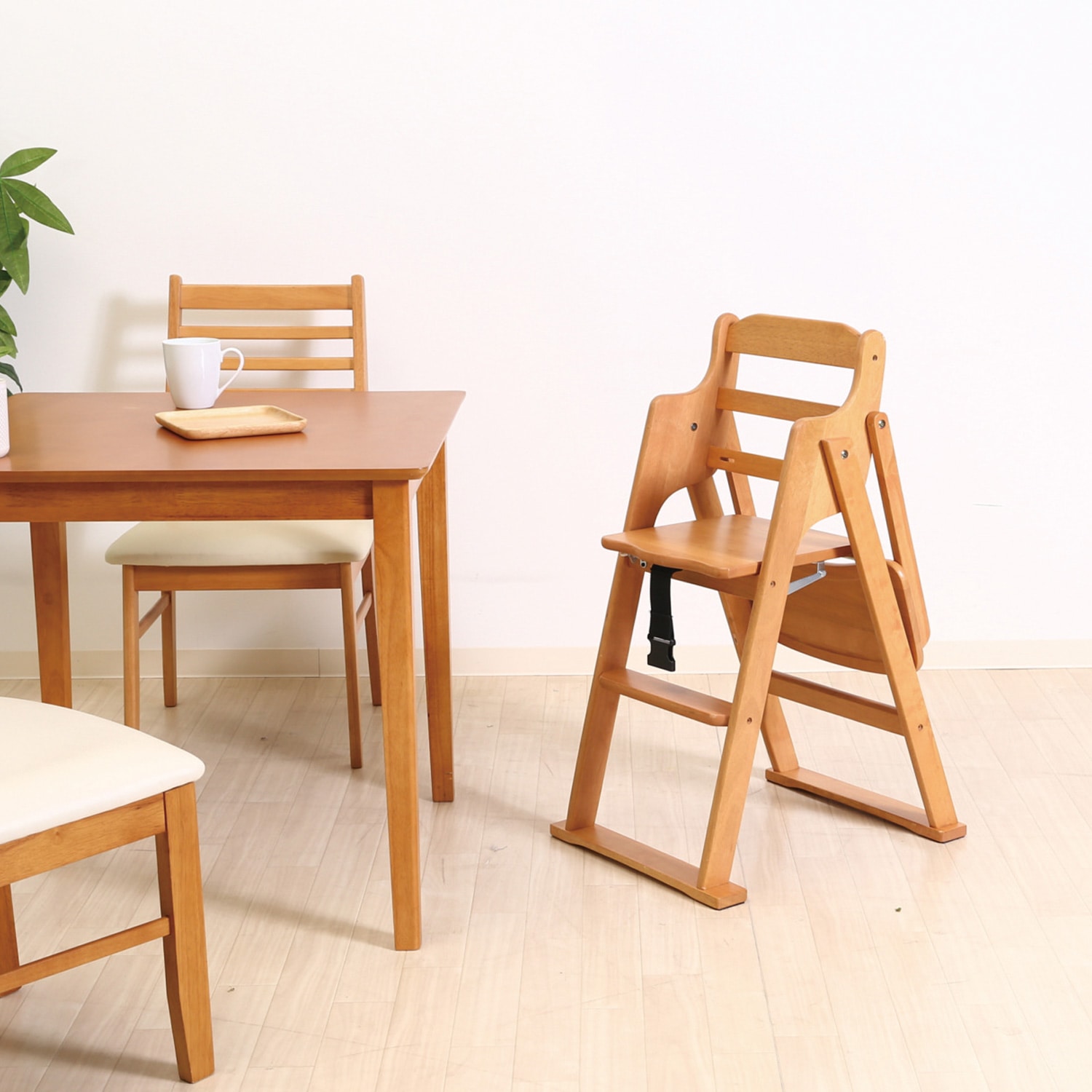 自然の温もりが育む木製折りたたみベビーチェア。お子さまと一緒に食事を楽しめるハイタイプのベビーチェア。丸みを帯びたデザインとセーフティベルトで安心。付属のテーブルは後ろに倒すことができ、折りたたんで収納も簡単です。脚部にはフェルト付き。