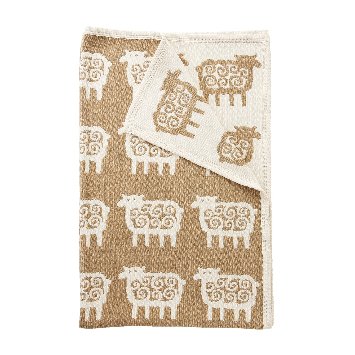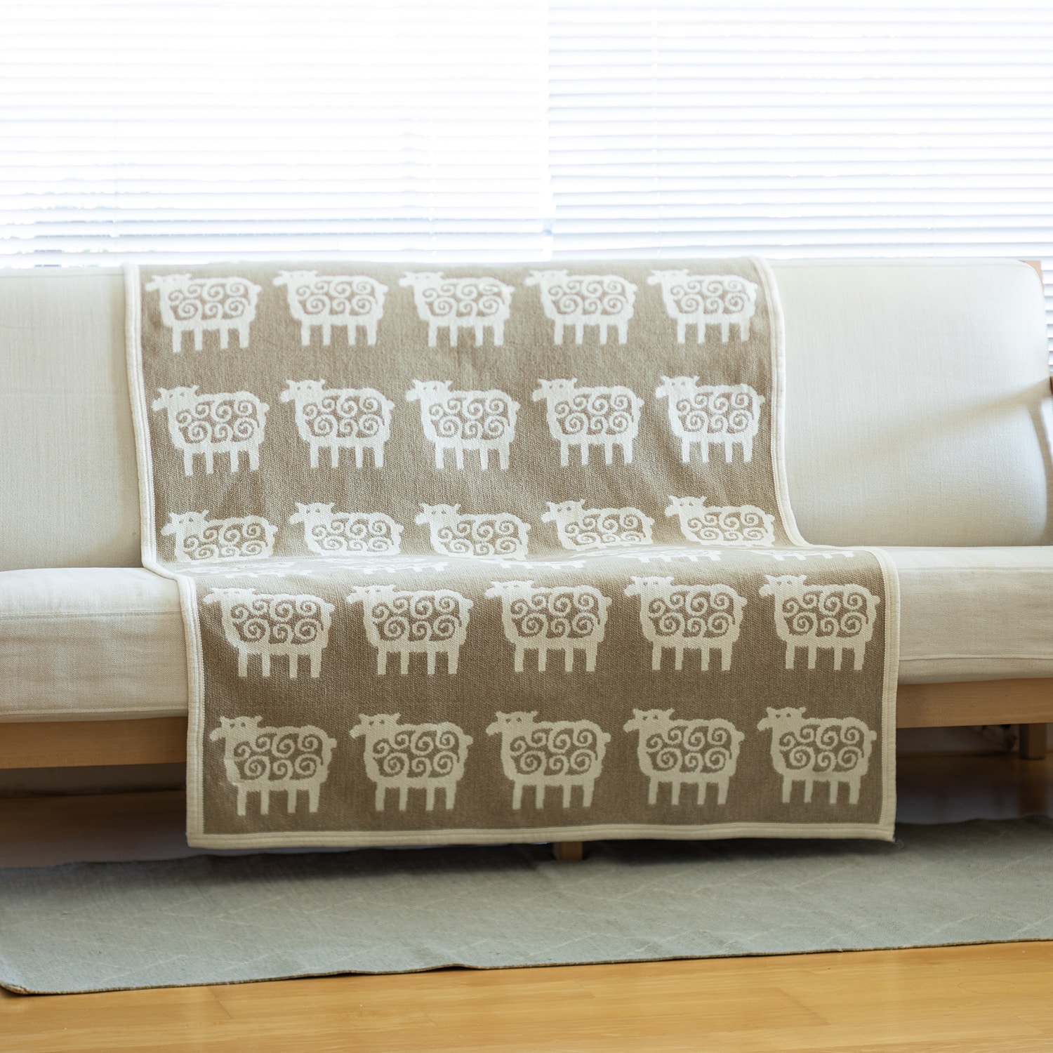 北欧らしいカラーリングに、ちょっととぼけた表情のひつじ柄が愛らしいハーフサイズのコットンブランケット。国際認証を取得したオーガニックコットンのシュニール糸を使用しているため、ふわふわの肌ざわり。しっかり織りあげてあるため、洗濯機でくり返し洗っても型崩れせず、ずっとソフトなまま。表裏でカラーリングが反転するリバーシブル仕様です。