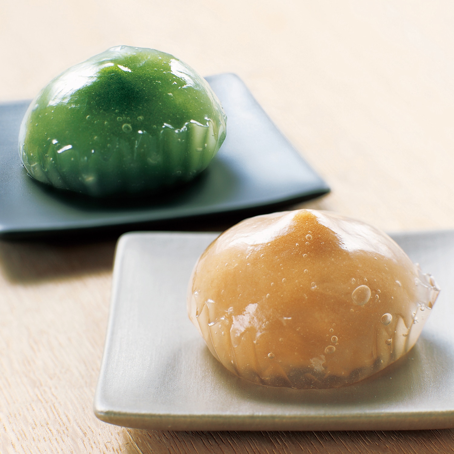 - 水まんじゅうは、モチモチ透明な生地で餡を包んだ、京都の銘菓。宇治の老舗・堀井七茗園の抹茶を使った水まんじゅうは、さすが、抹茶餡が濃厚。しかも決して甘すぎず、ほろ苦さが感じられる大人の味わいです。もう1種類のきな粉餡も、大豆の香ばしさが際立っています。冷凍で届くので、冷蔵庫で解凍を。少しひんやりしているほうが、おいしく召し上がっていただけます。