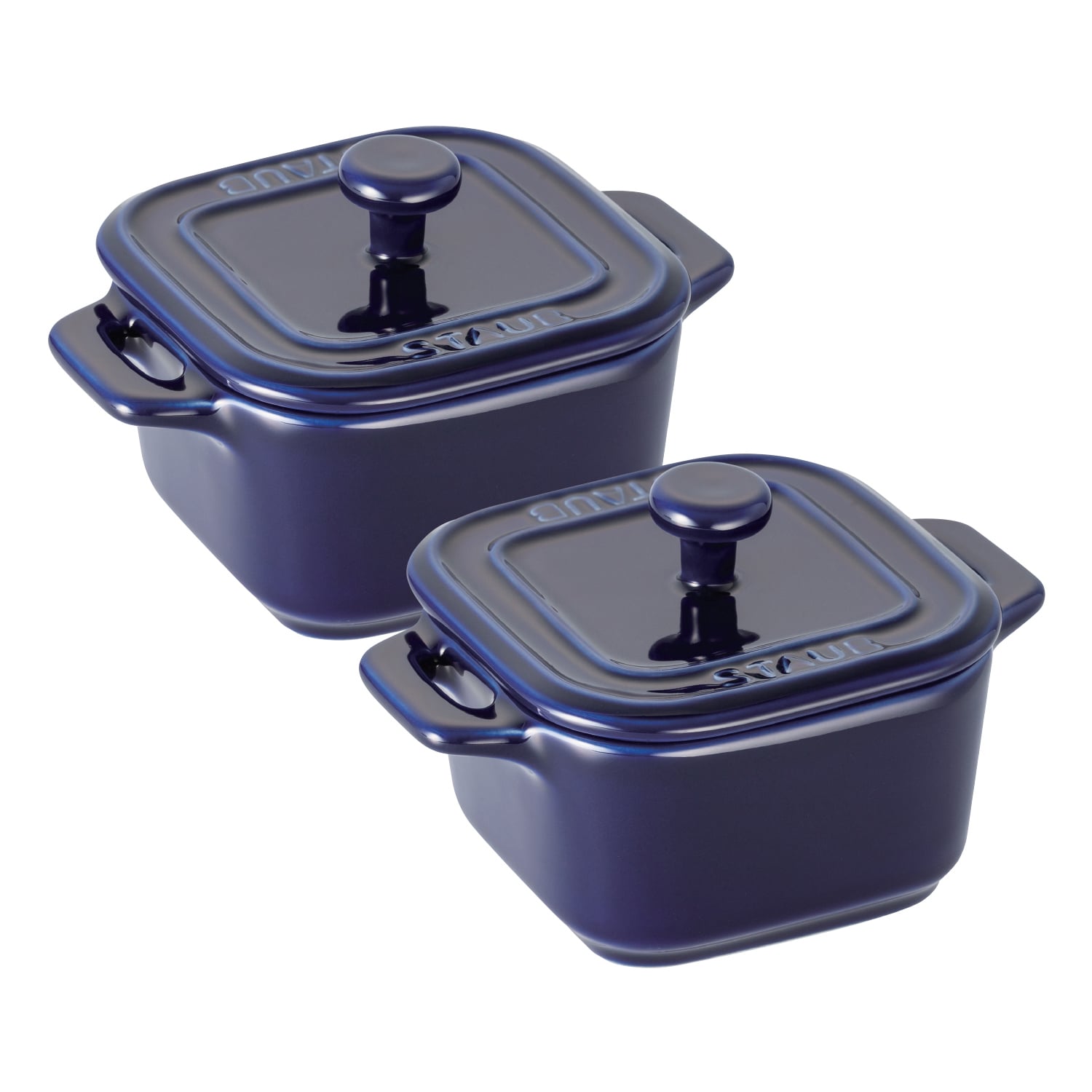 「ストウブ」は使い勝手のよいセラミックや鋳物の調理器具で世界的に知られています。こちらは容量100mlと、可愛らしいサイズのココットのペアセット。小さなおつまみや付け合わせのほか、テーブルにそのまま載せるソースや焼き菓子などに使っても。カラーはテーブルが華やぐチェリーレッドと、ノーブルな印象のブルーの2種類です。