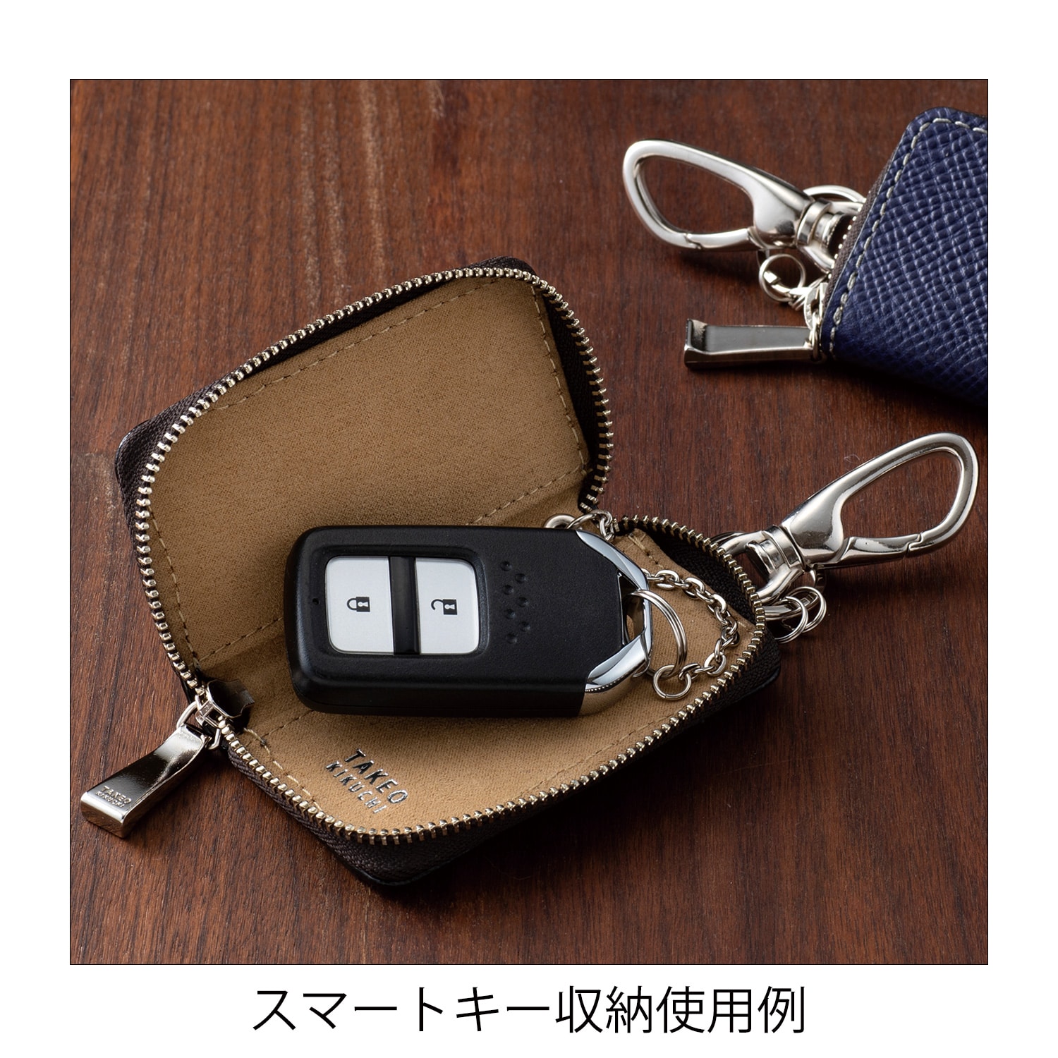 「タケオキクチ」は、色気と遊び心があり、今の時代をさりげなく着こなす男性のためのブランド。確かな品質のモノづくりで多くの支持を集めています。傷が目立ちにくいシボ加工の牛革を使用したリンベルオリジナルのキーケースは、車のスマートキーを収納できるキーケースです。使うほどに手になじむ素材と、デザインにこだわった上質なアイテムは、「できる男」のしゃれた持ち物に。