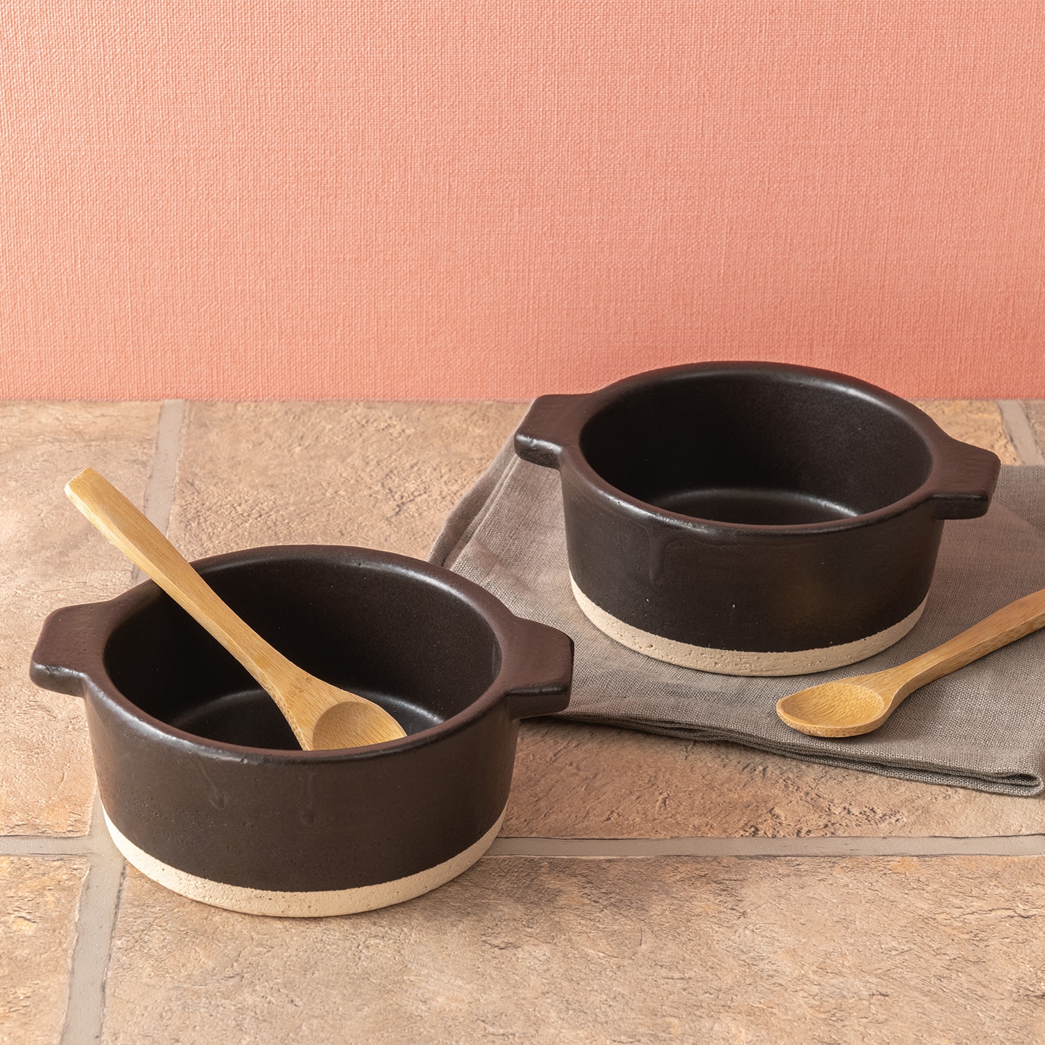 サイズ(約):(直径12×深さ5.5cm、満水容量300ml)×2/材質:耐熱陶器/直火使用可/付属品:スプーン×2/日本製(スプーン=中国製)〈電子レンジ可〉〈オーブン可〉