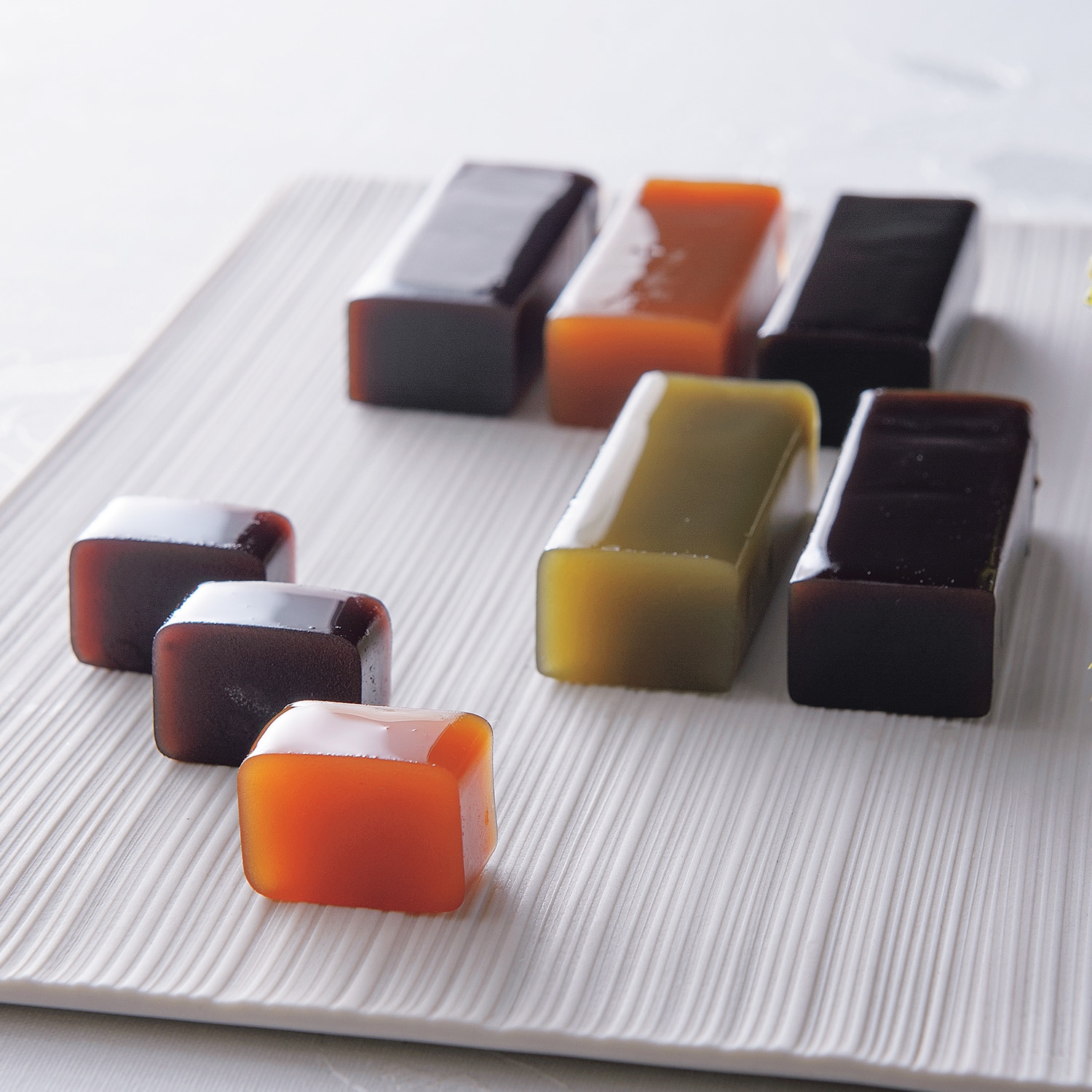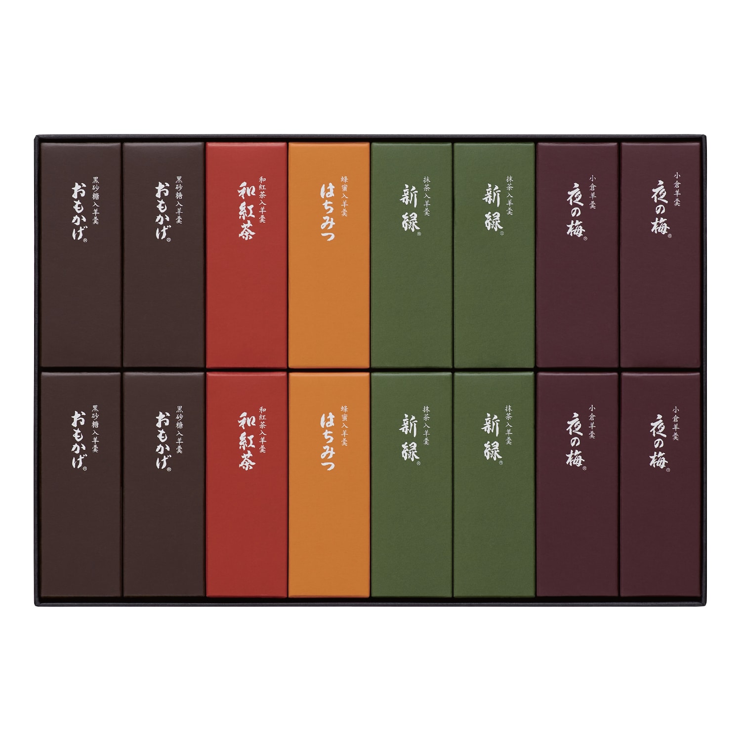 - 小倉羊羹「夜の梅」・黒砂糖入羊羹「おもかげ」・抹茶入羊羹「新緑」各50g×4、蜂蜜入羊羹「はちみつ」・和紅茶入羊羹「和紅茶」各50g×2