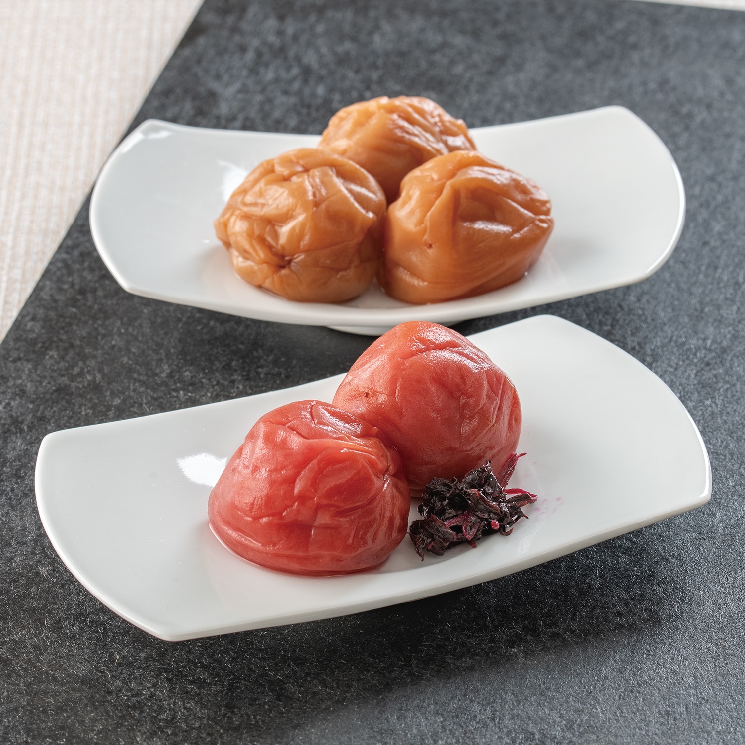 - 梅の産地として知られる和歌山県。そこで収穫された梅を使い、シンプルに、ふたつの味に仕上げました。「はちみつ漬梅干」は塩分約8%の低塩で、フルーティな香りとほんのりとした甘さが口いっぱいに広がります。そのまま食べても美味ですが、種をとって練り梅にするなど、料理素材としても活躍します。