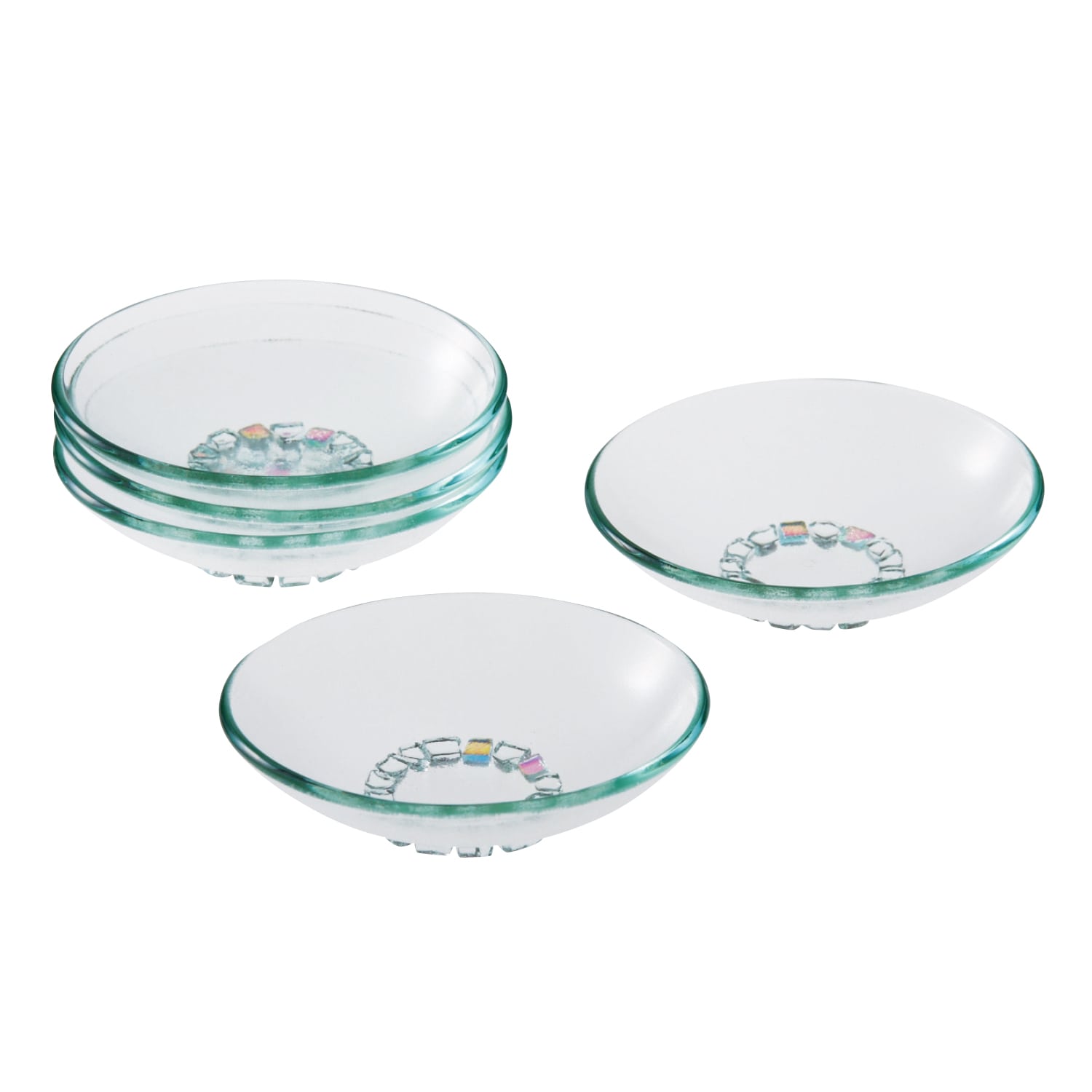 なめらかできれいな断面に技術の高さを感じる、フロートガラスの透明感を活かした豆皿。台座の部分に配した、オーロラ調のカラーガラスがきらきらと輝くアクセントになっています。少し深さがあり、手のひらにちょこんと乗るサイズは、おつまみを盛り付けたり、デザートやフルーツを盛ったり。日本酒の盃にしたりと使い勝手もいろいろに楽しめます。テーブル周り以外でも花器やアクセサリー入れなど、インテリアとしての使い途を想像するのも楽しい皿です。
