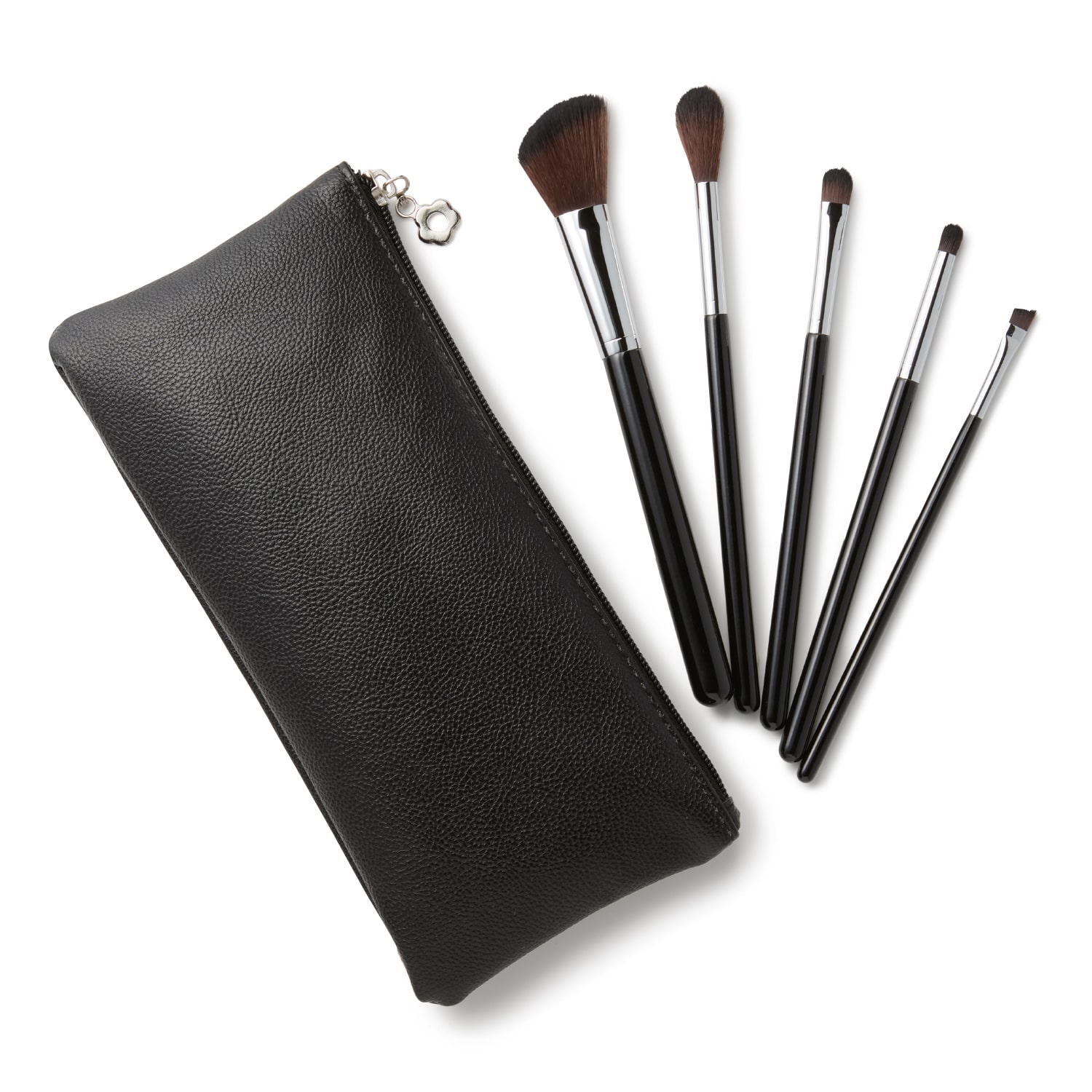 サイズ(約):チークブラシ=長さ19cm、ハイライトブラシ=長さ19cm、アイシャドウブラシ(丸平)=長さ17cm、アイシャドウブラシ(丸)=長さ17cm、アイブローブラシ=長さ15.5cm/材質:天然木、PBT/付属品:専用ポーチ/中国製