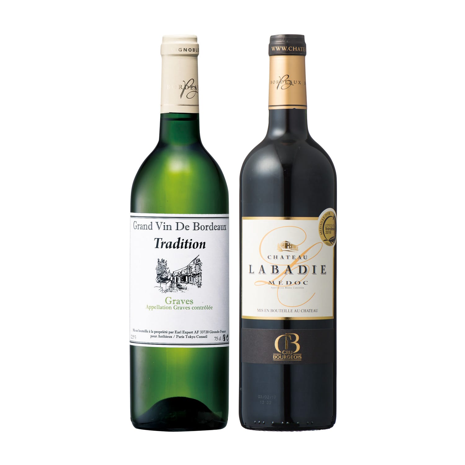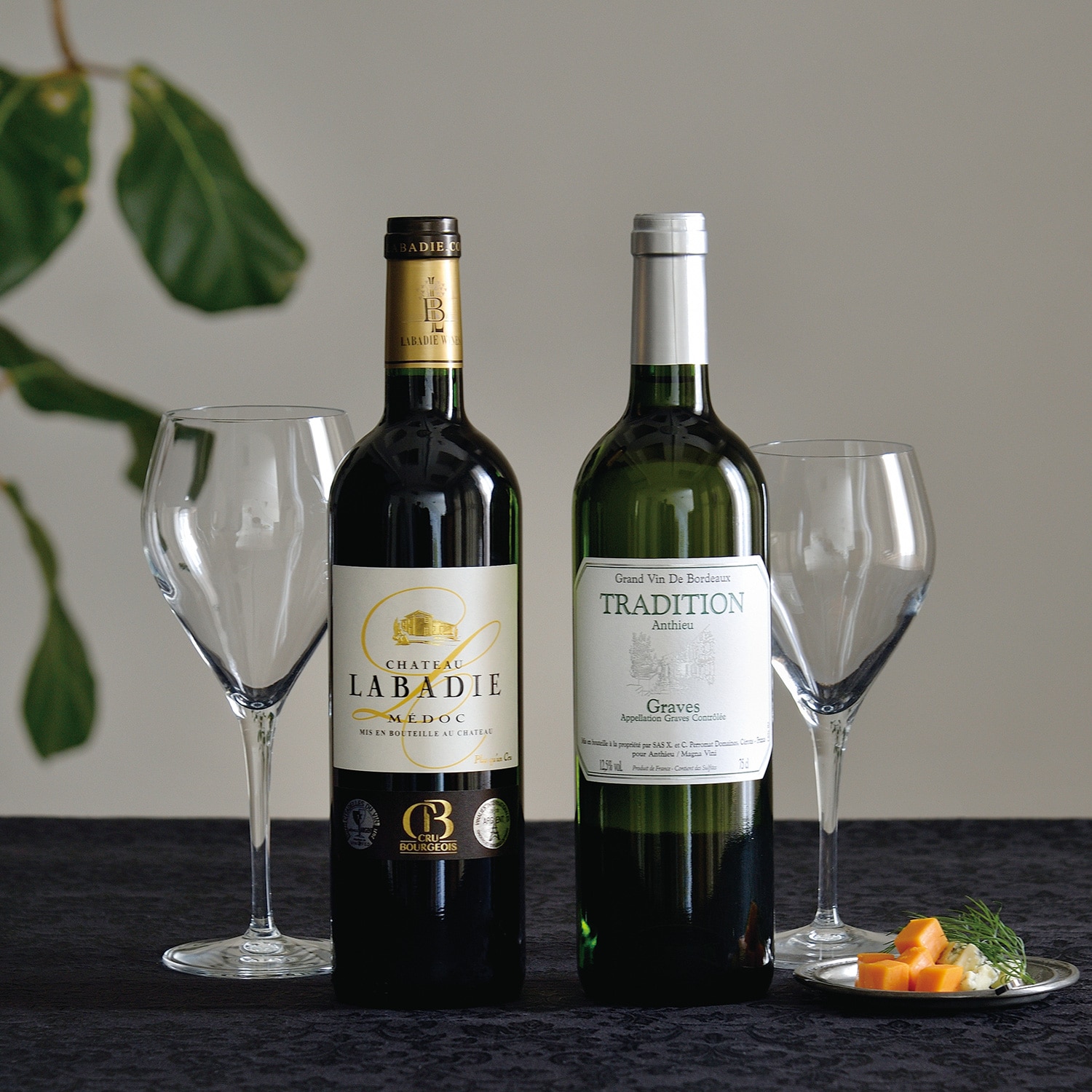 愛好家が多いフランス・ボルドーのワイン。「シャトー・ラバディ メドック・クリュ・ブルジョワ」は、メルロ63%、カベルネ・ソーヴィニヨン33%のフルボディの赤ワイン。フランス産オークの樽で熟成させた果実味を感じるアロマとタンニンのしっかりした骨組みを感じられる辛口のワインです。「トラディション グラーヴ・ブラン」は口当たりが力強く、同時にフレッシュで心地よいなめらかな舌ざわりが楽しめる白ワイン。食事に合わせて赤白のワインをお楽しみください。