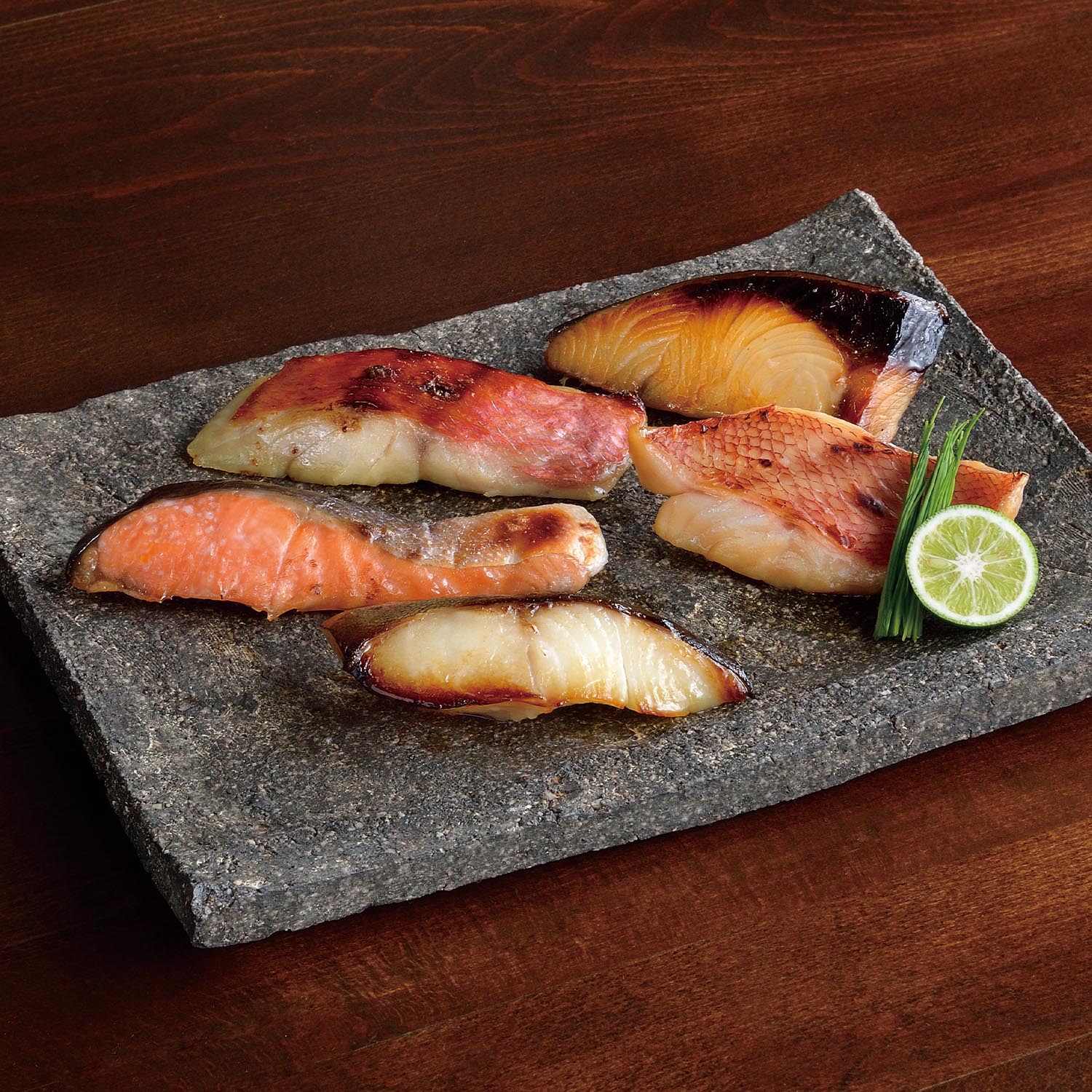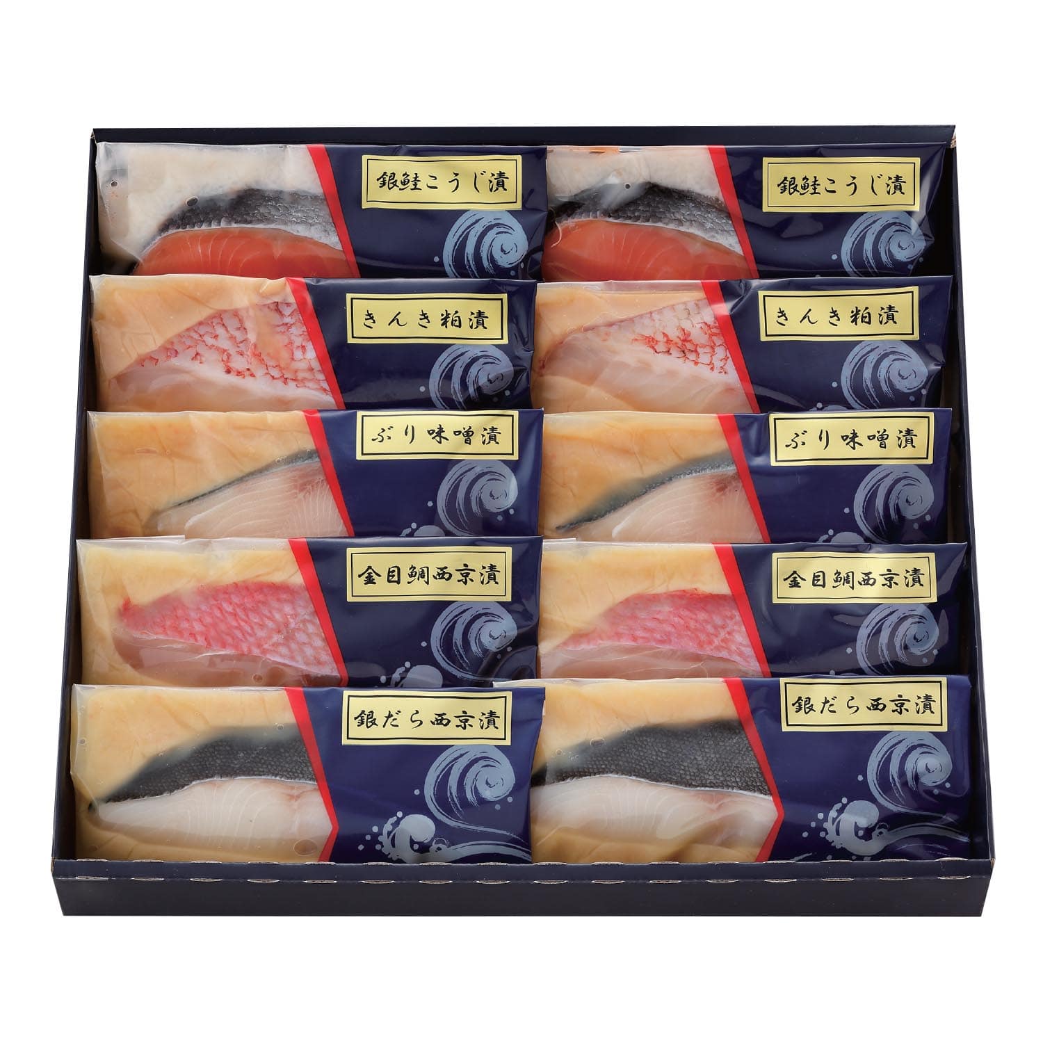 - 銀鮭こうじ漬・きんき粕漬・ぶり味噌漬・銀だら西京漬・金目鯛西京漬×各2切/賞味期間は冷蔵で11日/銀鮭:チリ産、きんき・銀だら:アメリカ産、ぶり:国産、金目鯛:ニュージーランド産