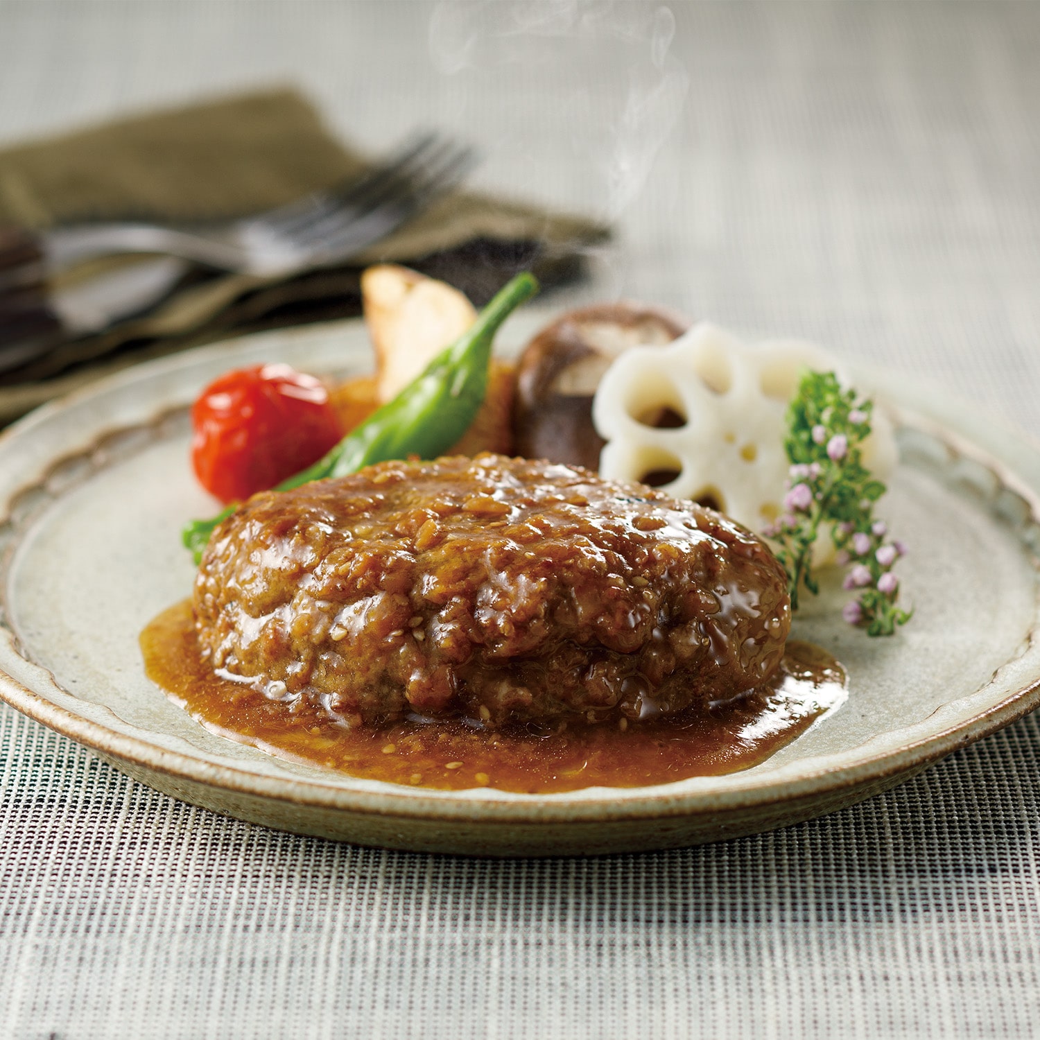 - ナイフを入れるとじゅわっとあふれだす肉汁─。日本で有名な和牛のひとつ、山形県の米沢牛を使って、贅沢なハンバーグを作りました。たっぷり加えた玉ねぎの甘みが肉の旨みを引き立て、また隠し味に椎茸と酒粕を加えることで、まろやかで奥深い味わいに。ふっくらやわらかいハンバーグは、オリジナルの和風ソースを絡めてお召しあがりください。